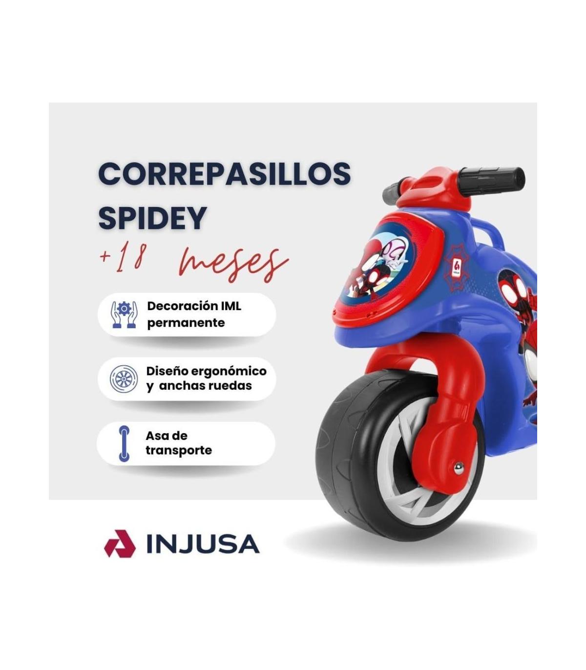 Correpasillos Moto Spiderman 69X28X49 Correpasillos Neox Spiderman color azul, recomendado para niños a partir de los 18 meses Con licencia oficial de marca y decoración permanente e impermeable Cuenta con ruedas anchas para mayor estabilidad y se fabrica 100% en España Cumple con las normativas de seguridad requeridas por la Unión Europea Altura de asiento: 33 cm, altura de manillar: 49 cm (desde el suelo) Máximo peso soportado: 30 kg.