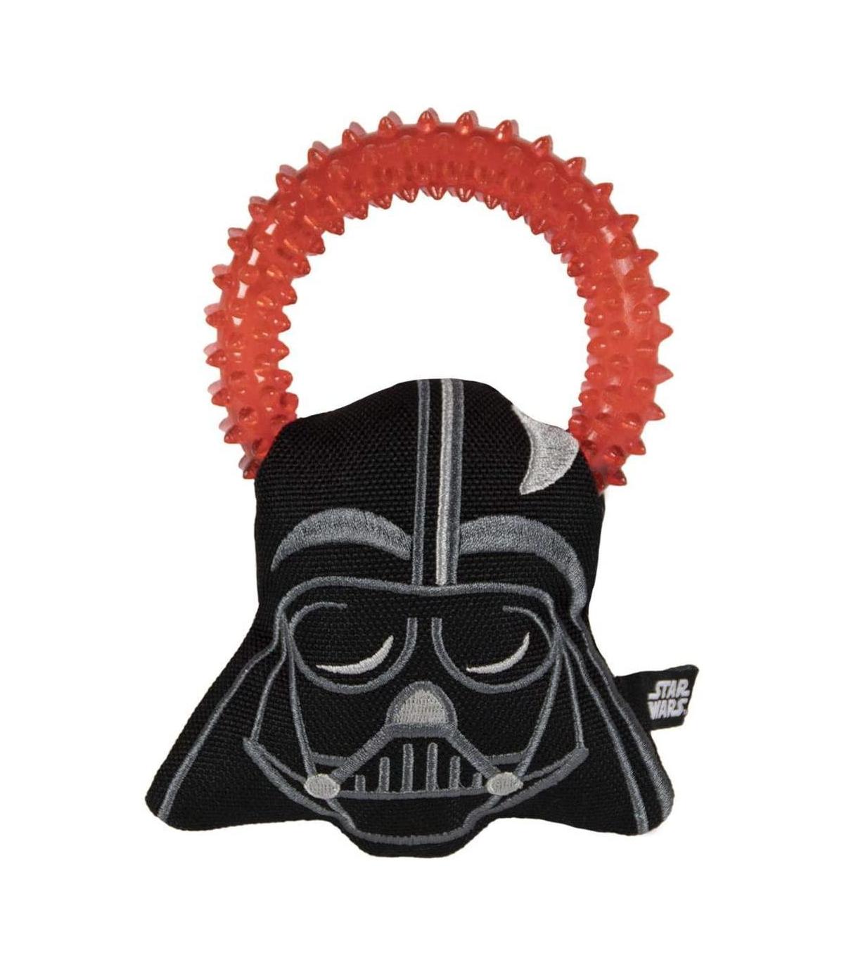 Mordedor Perro con peluche de Darth Vader y sonido incluido en la parte interior Consiente a tu peludo con este divertido juguete Juguete Perro con Aro hecho en goma termoplástica para proporcionar un buen agarre, Peluche hecho en tejido reforzado Peluche perro divertido y saludable - proporciona cuidado dental a tu peludo masajeando sus encias y limpiando sus dientes mientras juega Juguetes perro con aplicaciones 3D y elementos bordados, Un divertido juguete ideal mantener a tu perro activo y ejercitado mientras juega Mordedor de perro con medidas de 10 x 18,5 x 6 CM Rango de edad: Todas las etapas de la vida