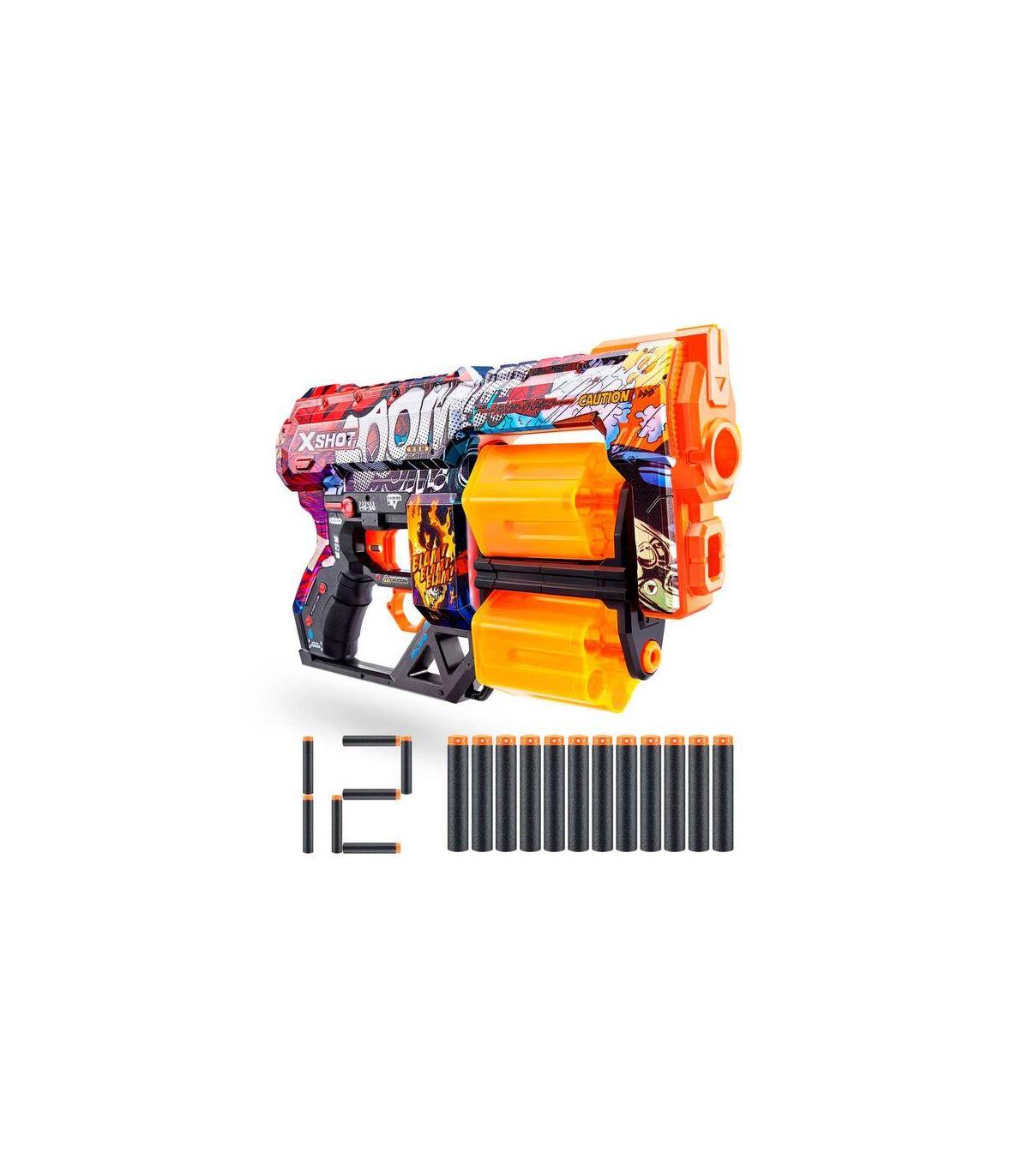 X-Shot Skins te ofrece la experiencia de traer tu Skin-blaster al mundo real. ¡El X-Shot Skins Dread con doble tambor giratorio para no parar en la batalla, tiene suficiente potencia para enfrentarse a objetivos a 27 metros de distancia! Elige tu modelo. Hay 5 diferentes y muchos más por venir. Viene con 12 dardos de espuma Air Pocket Technology, ahora más precisos ¡Elije diferente, elije X-Shot Skins!