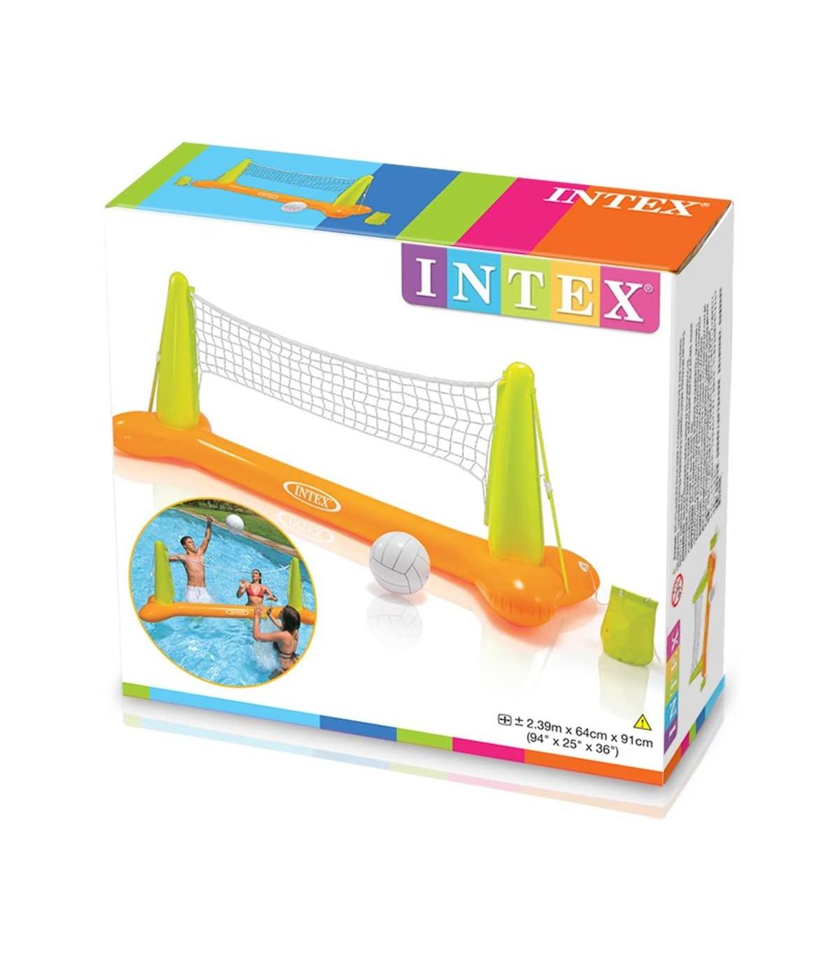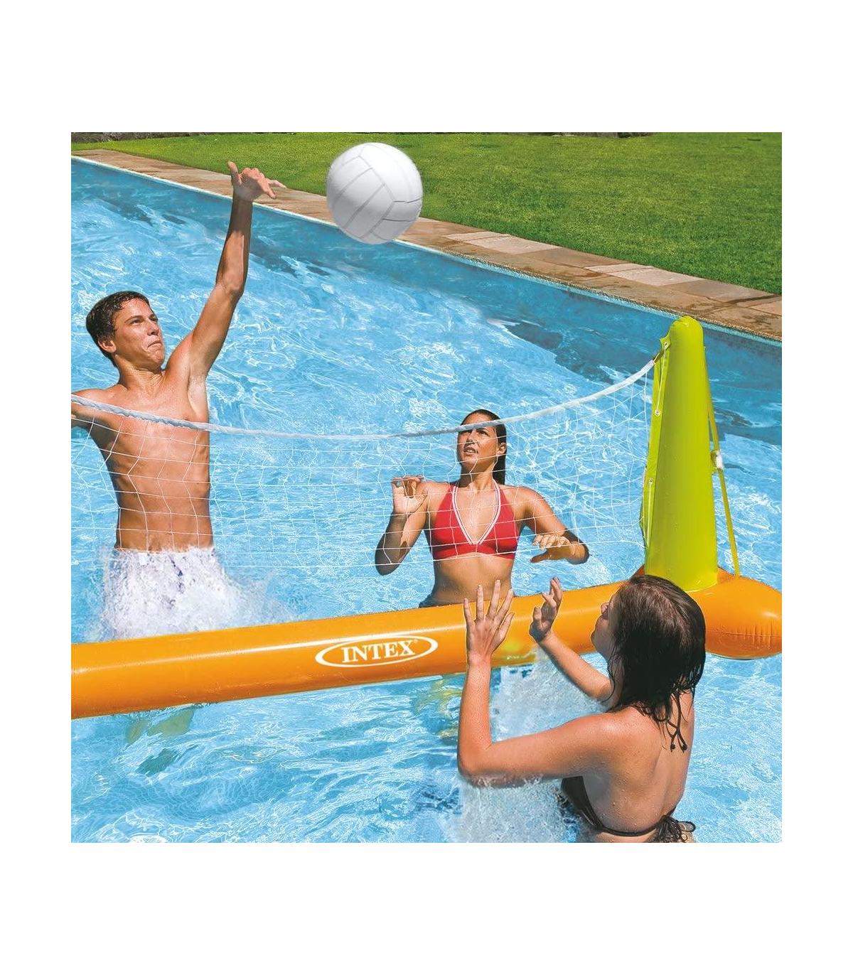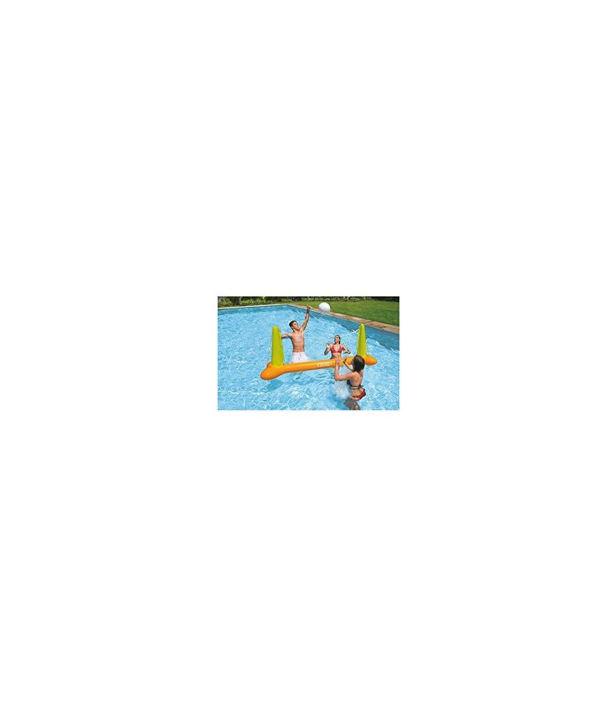 Juego de voleibol hinchable ideal para piscinas, medidas de la portería flotante: 239 x 64 x 91 cm Incluye una red y un balón de vóley de color blanco, material: vinilo resistente y color: naranja/verde Incorpora bolsas para colocar peso para mayor sujeción El juego de vóley está diseñado para ser utilizado a partir de 6 años Kit de parches para reparar pequeños poros o pinchazos