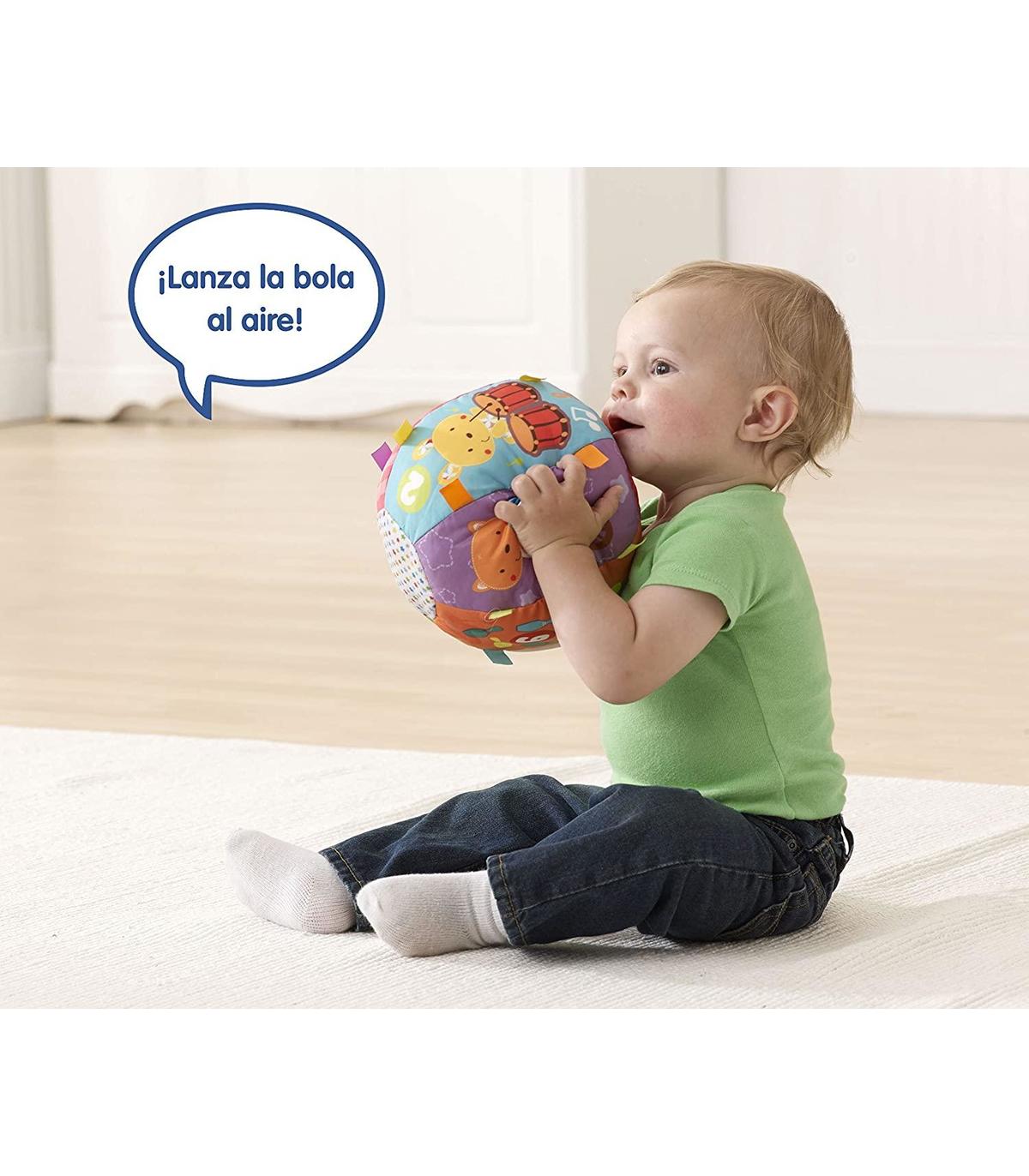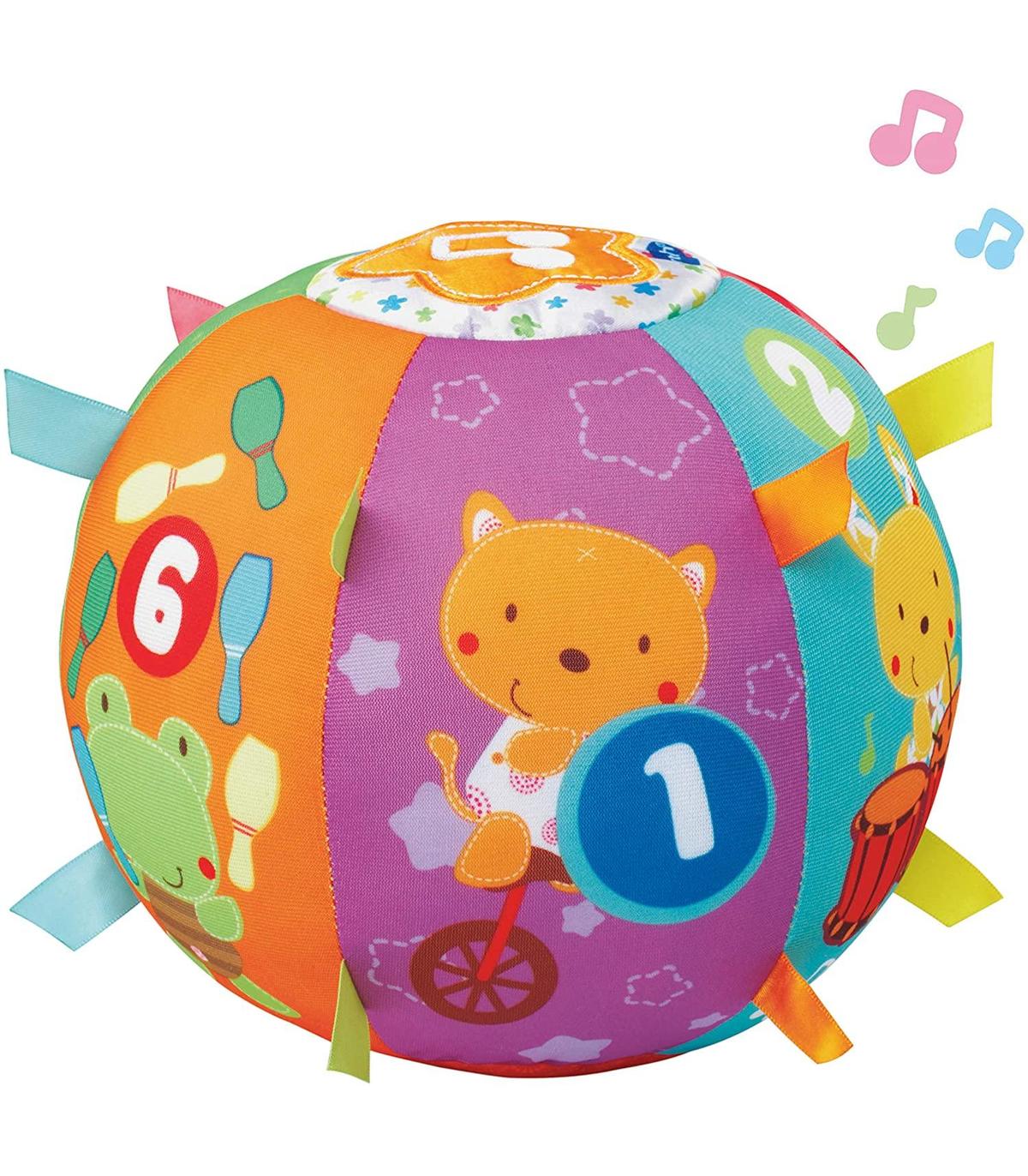 La Bola Cantarina es un suave peluche con diferentes texturas y cintas de colores que desarrollan el tacto y llaman la atención del bebé. Con ella aprendeá los números, colores y algunos animalitos. Con el botón grande de la parte superior se activarán la