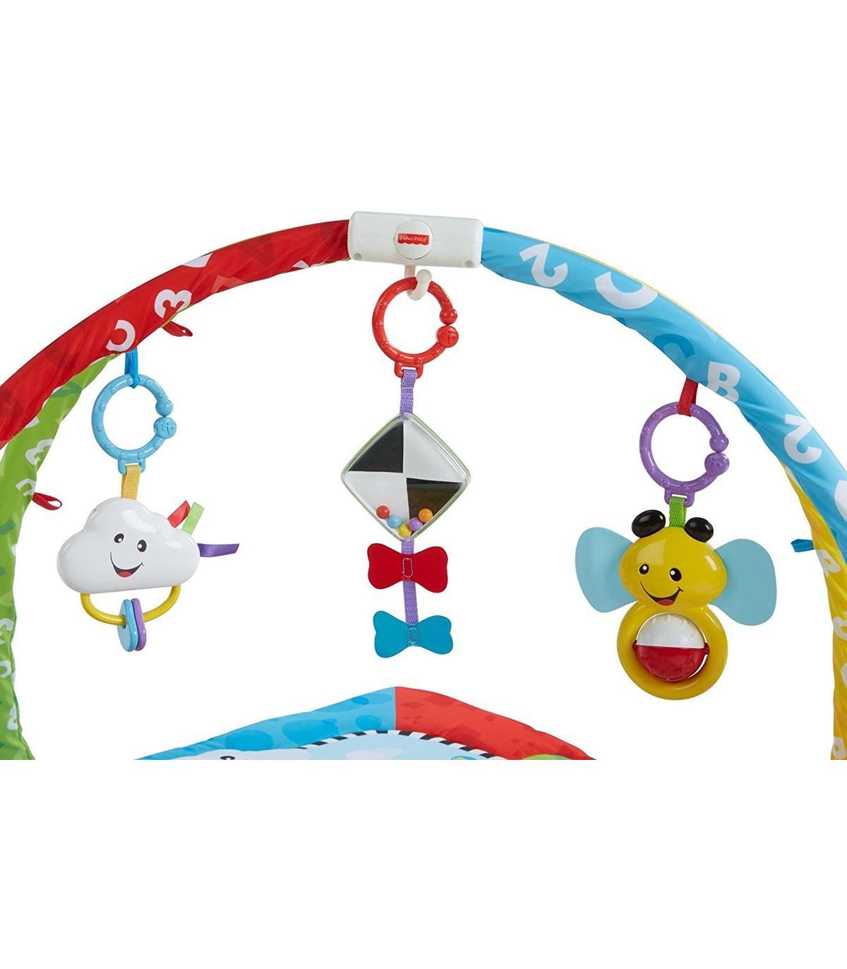 Gimnasio de aprendizaje portátil. Emite más de 20 minutos de música y canciones. Ayuda a desarrollar la motricidad gruesa del bébe ya que al intentar alcanzar los juguetes que estan colgados desarrolla la musculatura de los brazos y el cuello. El gimnasio ofrece dos opciones de juego e incluye 6 juguetes que se pueden colocar en diferentes partes del gimnasio. Se puede lavar a máquina. A tu pequeño le encantará pasar por las distintas etapas de desarrollo con el Gimnasio aprendizaje de Perrito y sus amigos El gimnasio presenta dos opciones musicales. La opción Mira y escucha ofrece más de 20 minutos de música ininterrumpida, como canciones para cantar y melodías instrumentales Al dar golpecitos a la plataforma de activación o la barriga de Perrito, el gimnasio premia al niño con palabras, sonidos divertidos y frases sencillas Incluye seis juguetes cargados de entretenidas actividades, como un espejo con un sol y un sonajero en forma de cometa El niño también puede llevarse la música y los aprendizajes de paseo!