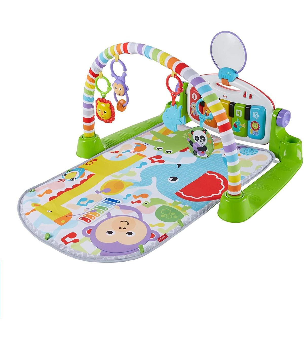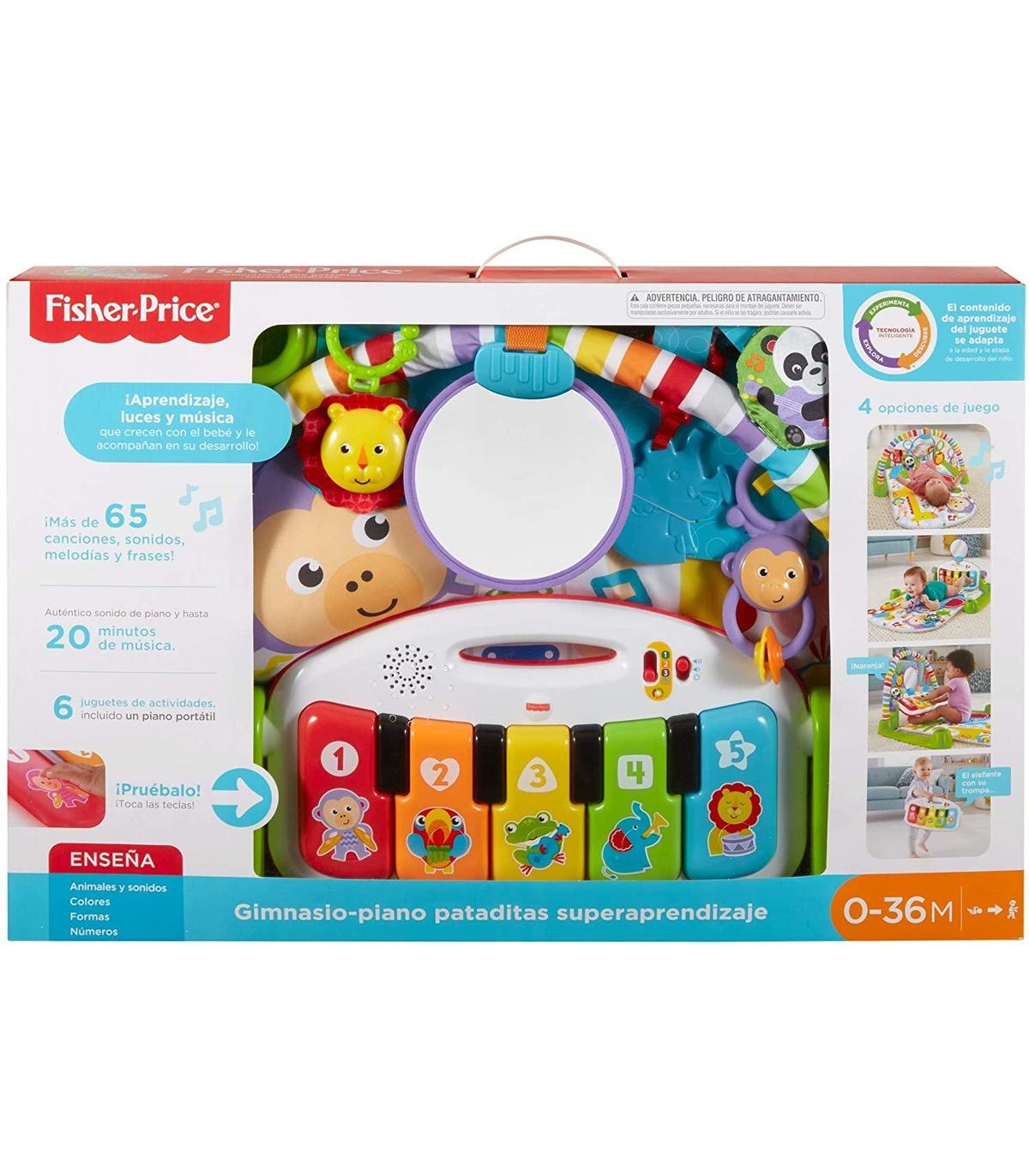 Los niños tienen montones de actividades a su alcance en este gimnasio superaprendizaje con cinco teclas de piano que se iluminan, un arco con juguetes que se puede recolocar y cuatro opciones musicales que entretendrán al niño varios años. El niño primero juega boca arriba y luego boca abajo hasta que puede mantenerse sentado para jugar con el piano; además, la música y las frases cambian con él: gracias a la Tecnología Inteligente, se puede adaptar el contenido de aprendizaje a su edad y desarrollo. Las teclas del piano suenan de verdad y animan al pequeño Mozart a crear sus propias melodías. ¡El teclado incluso se puede desmontar para llevarse la música a todas partes! ¡Aprender es divertido! Habilidades sensoriales: Un montón de colores alegres, la gran variedad de texturas y una serie de canciones animadas, sonidos y frases captan y estimulan los sentidos del niño. Motricidad gruesa: Con todo ese movimiento para tocar el piano, apretar teclas y empujar piezas, el niño ejercitará los músculos. Curiosidad y descubrimientos: El niño querrá jugar y una otra vez cuando se dé cuenta de que ciertas actividades tienen premio, como las alegres melodías que emite el piano cuando toca las teclas. Conceptos básicos de aprendizaje: A medida que el niño juega a dar pataditas, suenan canciones y frases que refuerzan lo que ve y le enseñan los colores, las formas, los números y los animales.