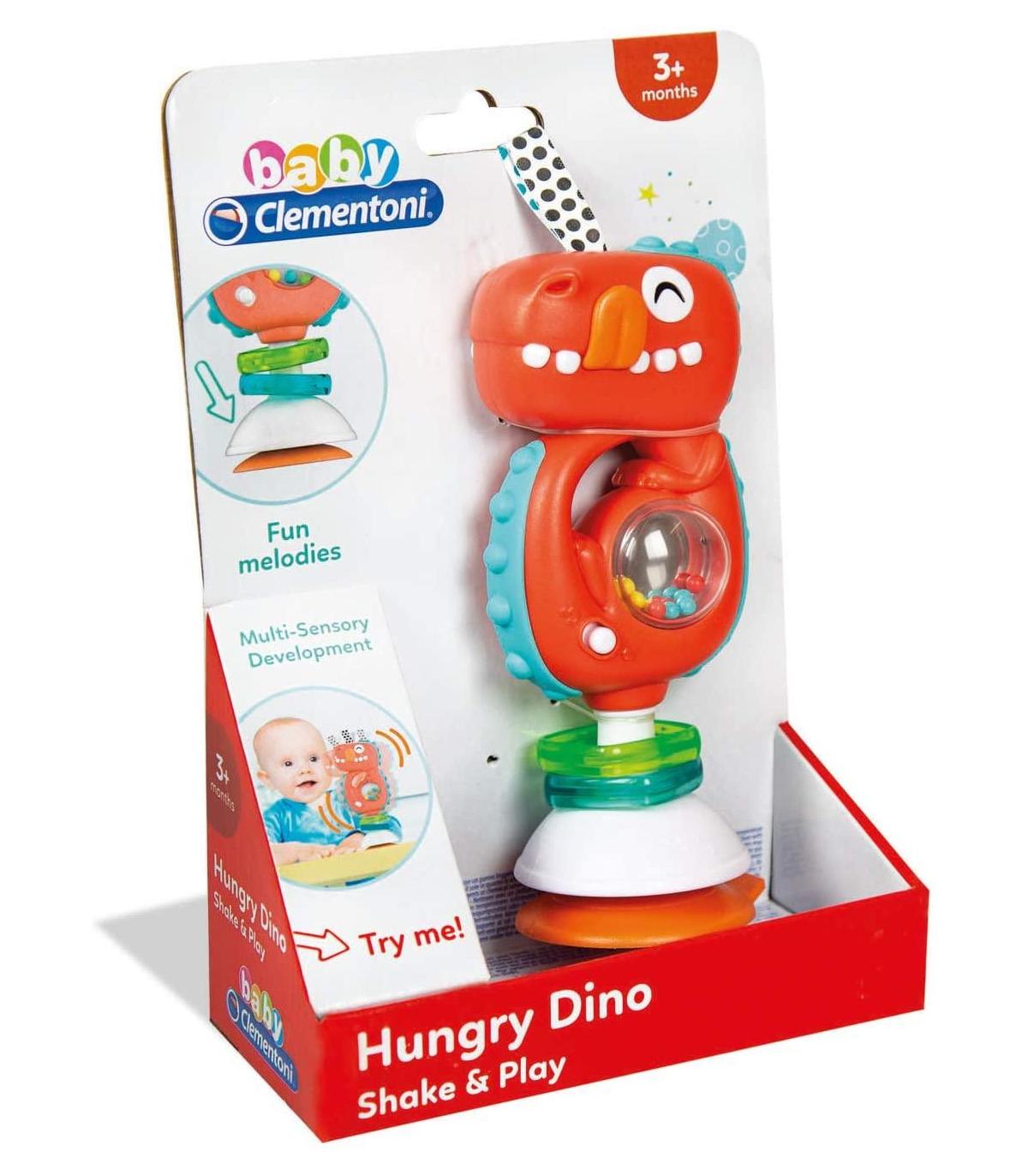 Divertido sonajero con forma de dinosaurio para entretener al niño a la hora de comer Al agitar el sonajero se activan divertidas melodías y efectos sonoros, mientras que las bolas de colores y los colgantes llamarán la atención del niño, estimulando su percepción táctil Incluye una práctica ventosa para mantener estable el sonajero sobre una mesa o silla alta a la hora de la comida Estimula la habilidad manual y la capacidad visual De plástico suave y resistente