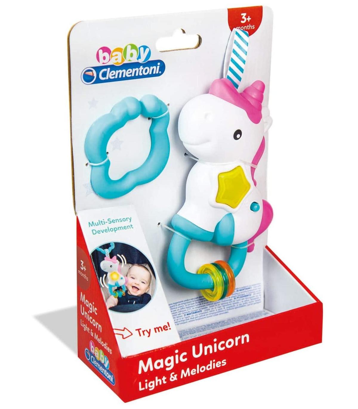 Sonajero Musical Unicornio Un unicornio mágico para entretener al niño con luces y música Tiene un botón luminoso con forma de estrella y colgantes de colores para crear divertidos efectos sonoros Su práctica anilla está diseñada para colgar el sonajero a la cuna o al cochecito y llevarlo a cualquier parte Desarrolla la habilidad manual y la concentración De plástico suave y resistente