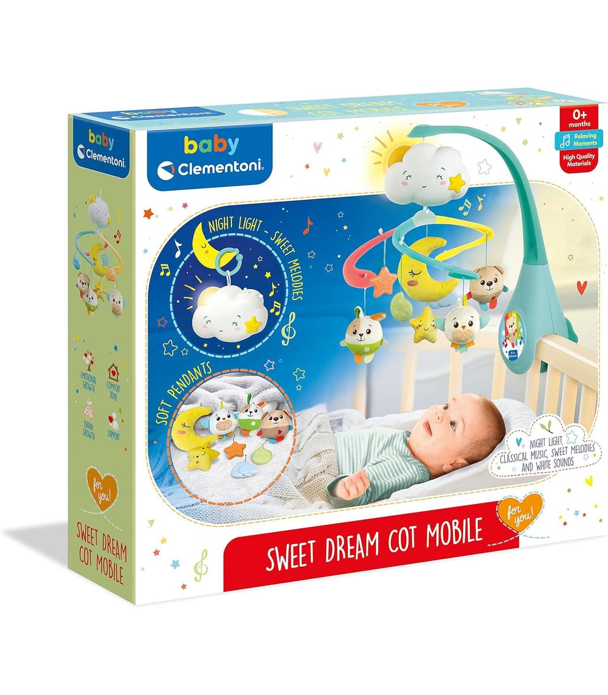 La suave y lenta rotación de los personajes, hechos en tela suave, llama la atención del bebé; y favorece su desarrollo visual, a la vez que lo acompaña suavemente hacia el sueño.