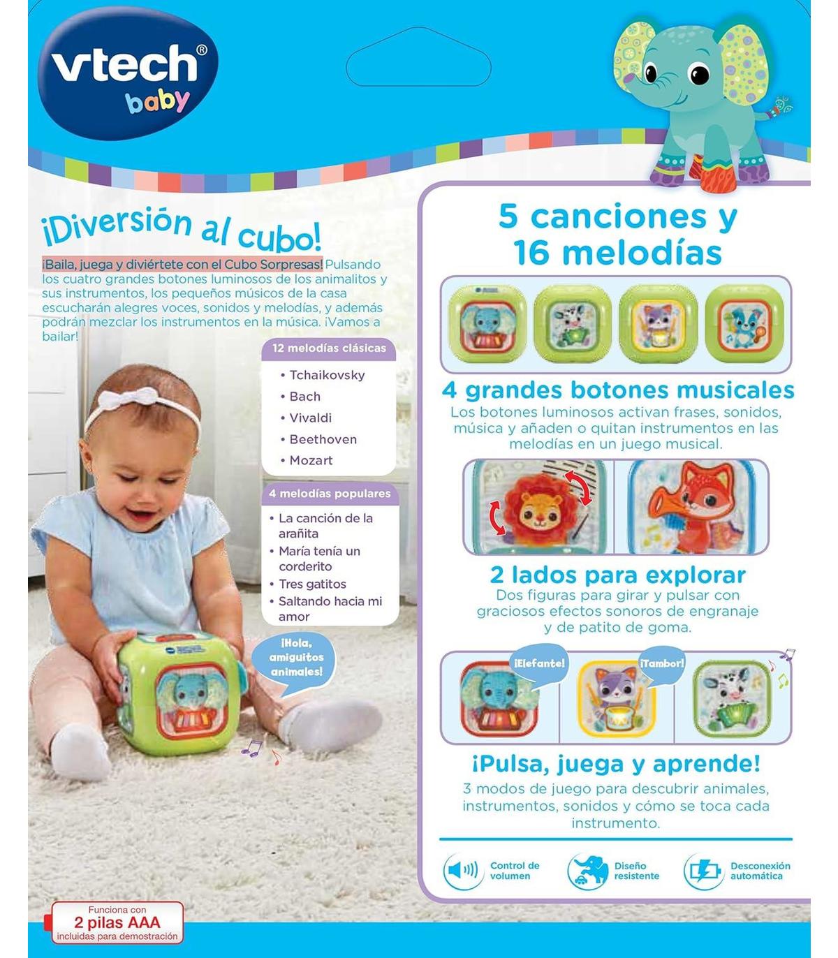 CONTENIDO EN ESPAÑOL – Juguete musical interactivo para tu bebé a partir de 6 meses, con múltiples caras que ofrecen actividades sensoriales y un aprendizaje temprano enriquecedor. ACTIVIDADES INTERACTIVAS – Tu pequeño podrá explorar 6 lados repletos de botones luminosos, figuras de animales y piezas giratorias que estimulan su motricidad fina y despiertan su curiosidad. 16 MELODÍAS Y 6 CANCIONES – Ofrece canciones clásicas y populares con luces sincronizadas, para que tu bebé se divierta y desarrolle su amor por la música de forma multisensorial. 3 MODOS DE JUEGO – Permite a tu niño descubrir animales, instrumentos y efectos sonoros, fomentando el aprendizaje de vocabulario y conceptos musicales de manera lúdica y divertida. DISEÑO ERGONÓMICO – Gracias a su tamaño compacto y ligero, tu bebé podrá sujetarlo y llevarlo fácilmente, disfrutando de aventuras musicales en cualquier lugar. SEGURIDAD & EDUCACIÓN – VTech se caracteriza por fabricar los juguetes más seguros y resistentes del mercado, incluyendo materiales y acabados de alta calidad que permiten a tu pequeño jugar de una manera segura. FUNCIONES PRÁCTICAS – Cuenta con control de volumen y función de desconexión automática para que puedas gestionar el uso de forma cómoda y eficiente.