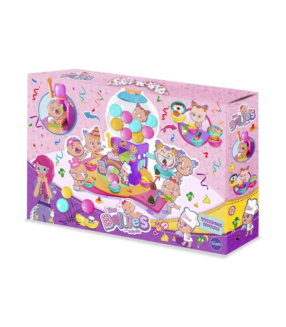 Bellies'ball Appetite es el nuevo playset de los Bellies y los Mini Bellies con el que pondrá darles de comer de manera divertida. ¿Cómo funciona? Gira la rueda y deja que una bolita con comida caiga por el tobogán, los niños tendrán que abrirla y descubrir qué comida van a comer los Bellies y ponerla en la cinta transportadora de comida. ¡Puede ser una comida divertida o asquerosa como el batido de pipí o el queso podrido! ¡Hay diez diferentes! Cuando los Bellies no quieran comer más, podrán jugar con ella en la diana para dar de comer al payaso. Una vez que acaben, podrán guardar todas las comidas en sus respectivas bolas y volver a meterlas para poder jugar tantas veces como quieran. No viene incluido muñeco.