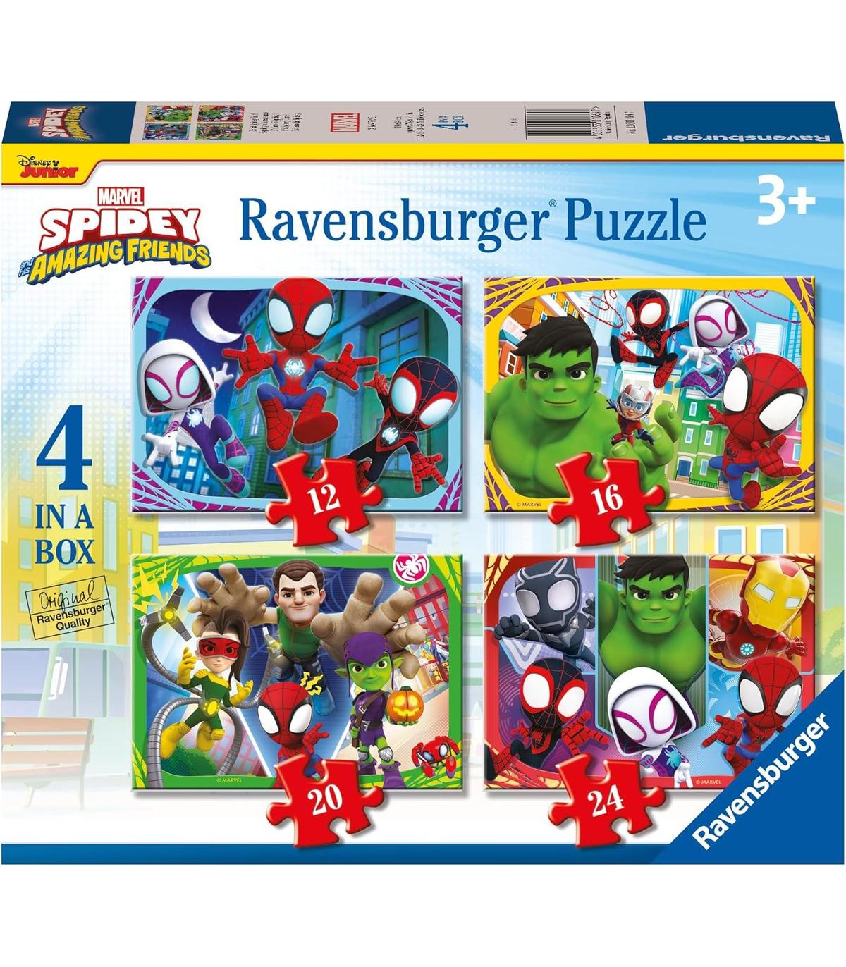 PUZZLE SPIDEY: Sumérgete en el mundo mágico de Marvel con el Ravensburger Puzzle Spidey y sus Amigos Increíbles. Este set infantil incluye 4 emocionantes puzzles con 12, 16, 20 y 24 piezas respectivamente, llevando a los niños a una emocionante aventura junto a sus personajes favoritos.