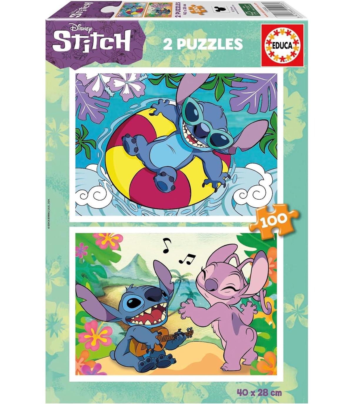 2x100 Stitch Incluye 2 puzzles cartón reciclado con : 100 piezas?? cada uno. ¡Diversión por partida doble!. Medidas aproximadas una vez montado: 40 x 28 cm. Compuestos por grandes piezas, perfectamente acabadas para que sea sencilla y segura su manipulación por los niños. ?? Estimula tu mente y creatividad: Los puzzles de Educa son una actividad perfecta para desarrollar la motricidad fina, la memoria visual y la psicomotricidad, además de estimular la curiosidad y la imaginación de niños y adultos. ?? Producto respetuoso con el medio ambiente gracias a su producción con tintas vegetales, éstas se basan en materiales renovables y orgánicos con una liberación casi nula de CoV (compuestos orgánicos volátiles). Puzzles infantiles recomendados a partir de 6 años.