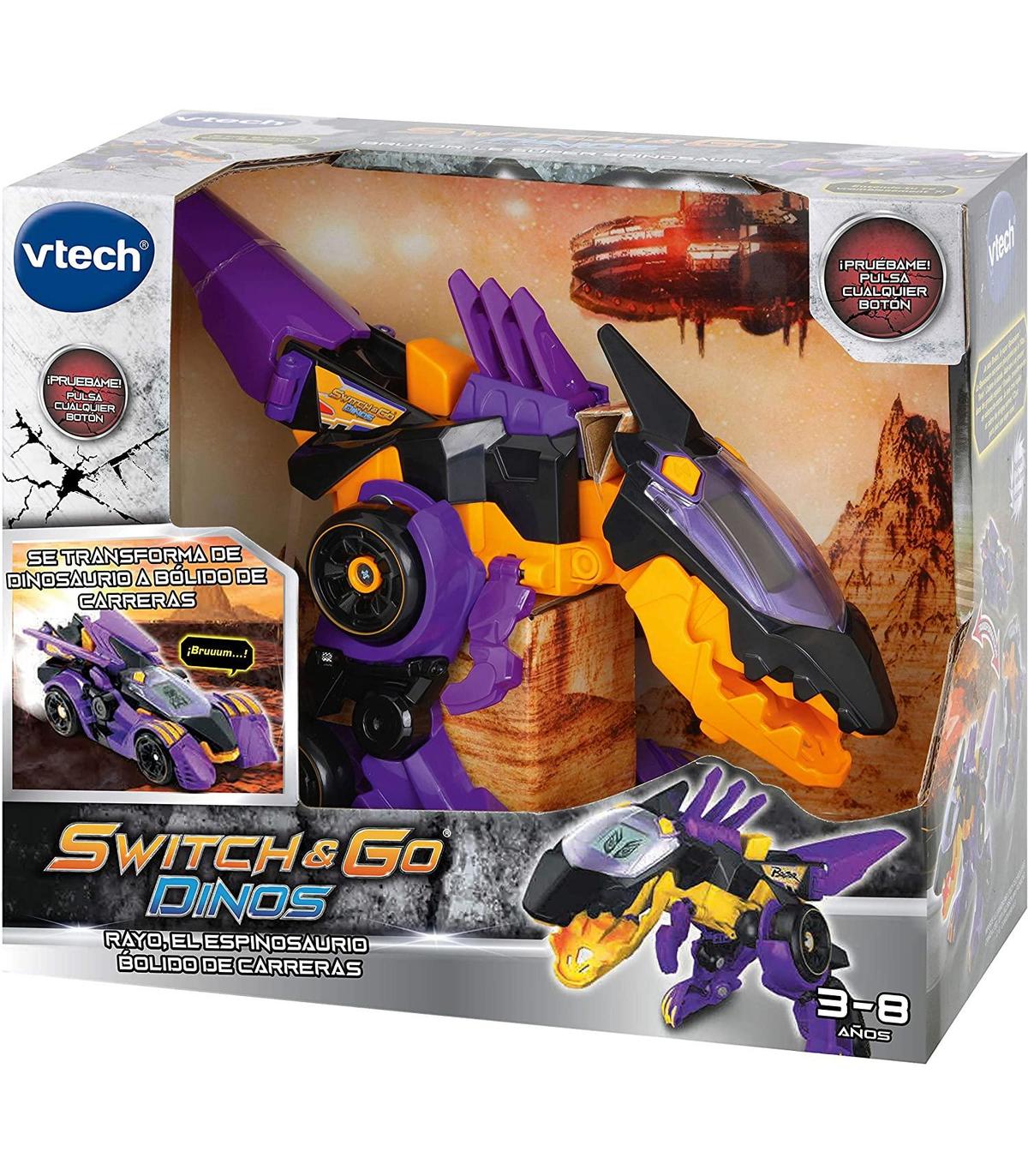 Switch & Go Dino Rayo, Espinosauriobolido Feroz dinosaurio con voz que se transforma en un velocísimo bólido de carreras El juguete identifica si se encuentra en modo animal o vehículo para responder en consonancia, su transformación es fácil y rápida Enseña datos curiosos sobre este tipo de dinosaurios, así como información de interés sobre el mundo de la competición Incluye tres botones que activan distintas voces, acción y efectos especiales y una pantalla LCD que muestra animaciones en función de si se encuentra en modo dino o en modo coche Pulsando el botón de acción, Rayo cobrará vida como un dinosaurio de verdad, moviendo sus fauces y activando efectos de luz Incorpora un sensor de movimiento para activar pisadas, rugidos o derrapes según la situación Las pilas son con finalidad demostrativa, se recomienda el uso de pilas alcalinas específicas para productos tecnológicos