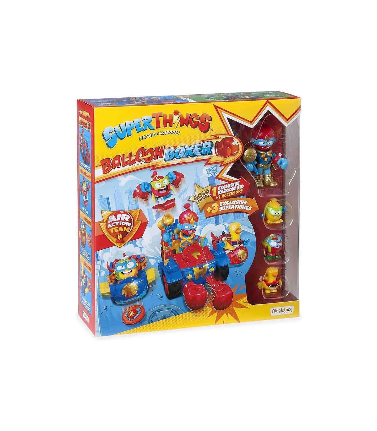 Contiene: 3 SuperThings exclusivos 2 pequeños vehículos que se pueden acoplar al transporte principal Pieza flexible en la parte de atrás del vehículo principal les permite saltar desde el suelo