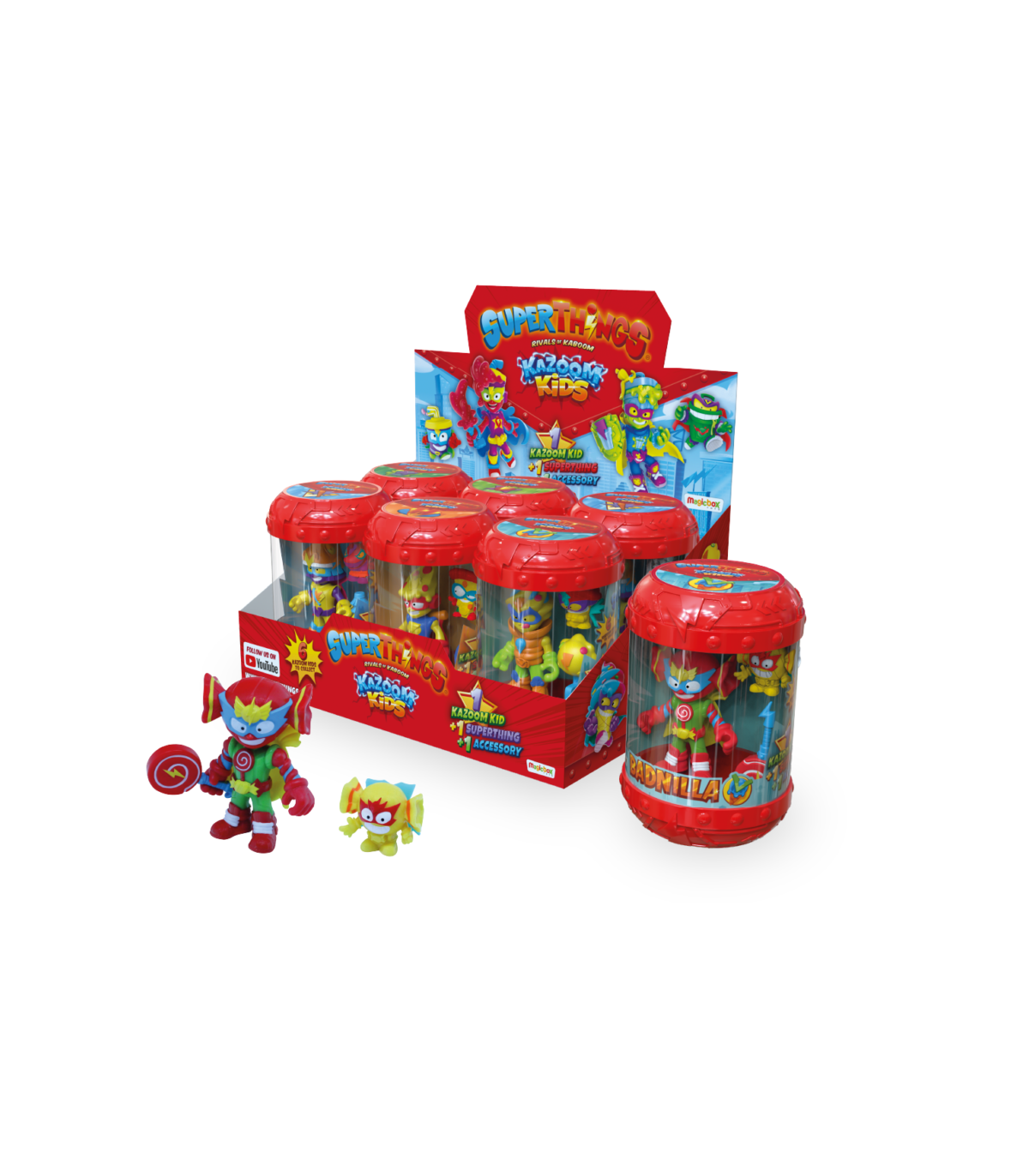 EL PRECIO ES POR UNA UNIDAD Contiene: 1 Kazoom Kid 1 Superthing 1 Checklist Hay Kazoom Kids para coleccionar! ¡Bienvenidos, Kazoom Kids! Los nuevos héroes y villanos de Kaboom City tienen asombrosos poderes. ¿Pero cómo los han conseguido? Neonblast, una chispa de energía surgida de un experimento fallido del Professor K está haciendo travesuras y cargando con la energía del Kazoom todos los objetos que toca. Cuando chicos y chicas normales entran en contacto con estos objetos… se transforman en Kazoom Kids y adquieren extraños poderes.