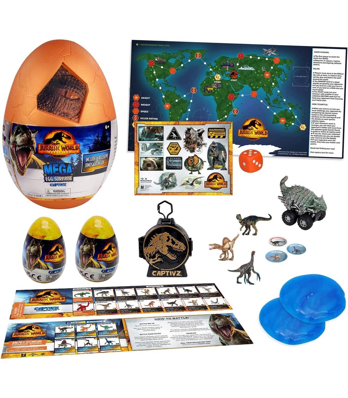 CONTIENE: 3x Dinos Surtidos, 3x Monedas de Batalla; 2x Slime, 1x Dino Pull Back, 1x Tablero y Dado , 1x Mochila, 1x Guía de Coleccionista, 2x Vasos de Huevo, 12x Stickers.