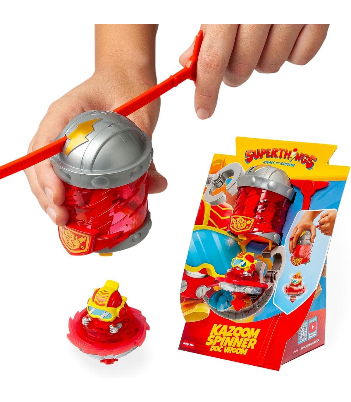 ACCIÓN SIN LÍMITES CON LOS KAZOOM SPINNERS – Lleva las batallas de los Superthings a un nivel totalmente nuevo. Cada peonza con su piloto y una base de metal para un giro estable y duradero INSERTA, ESTIRA Y LUCHA – Inserta la tira en la ranura, coloca tu spinner en la cápsula, y lánzalo… ¡que comience la batalla! ¿Quién será el último spinner en pie? Solo tú puedes decidirlo COLECCIÓNALOS TODOS: Hay 6 Kazoom Spinners para coleccionar: Enigma, Profesor K, Mr King, Doc Vroom, Lancelord y Equilibra ¡Completa la colección y crea infinitas combinaciones de combate! CÁPSULA CON EFECTO CRISTAL Y COLOR ÚNICO – Cada cápsula tiene un color y un icono exclusivo, ¡perfecto para personalizar tus ataques y crear enfrentamientos únicos! DIVERSIÓN Y ESTRATEGIA EN CADA GIRO – Experimenta la emoción de las peleas entre héroes y villanos de Kaboom City. Los Kazoom Spinners combinan habilidad, estrategia y adrenalina en cada giro. Puedes descubrir o seguir sus aventuras en los nuevos episodios de la serie de TV y en el canal de YouTube de Magicbox en español