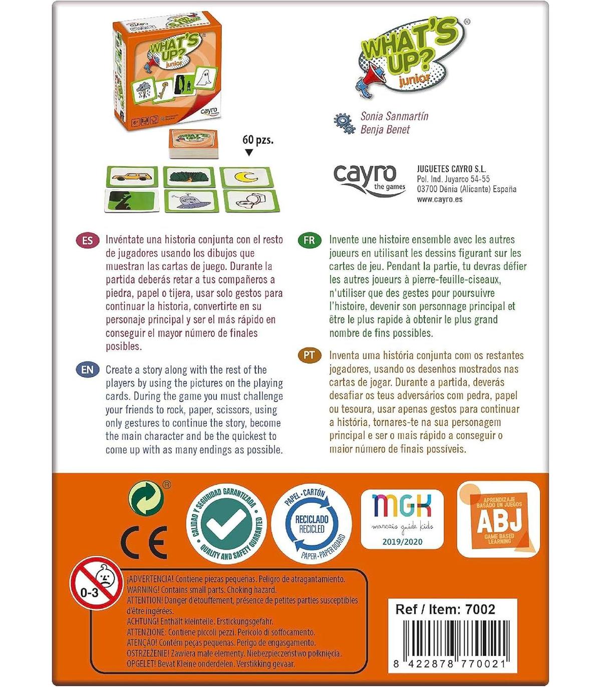 PARA NIÑOS: What's Up? Junior es un juego infantil de cartas de la marca Cayro. Este juego es ideal para niños y niñas a partir de 5 años y está diseñado para desarrollar habilidades cognitivas y múltiples inteligencias en los pequeños mientras se divierten jugando.