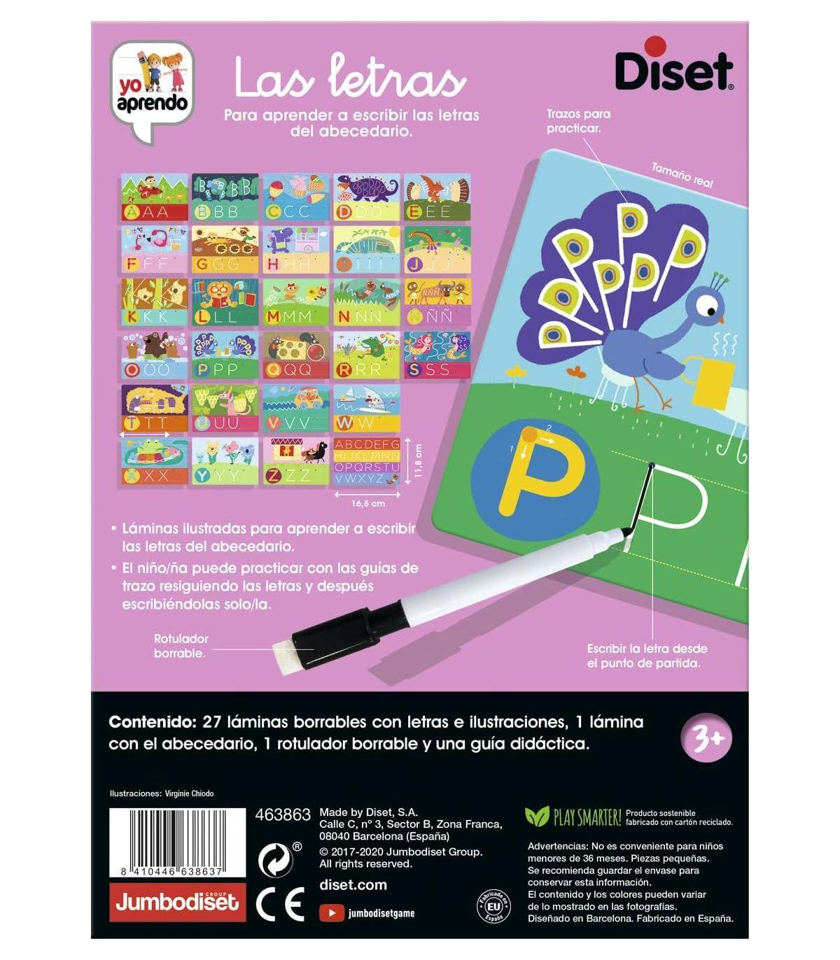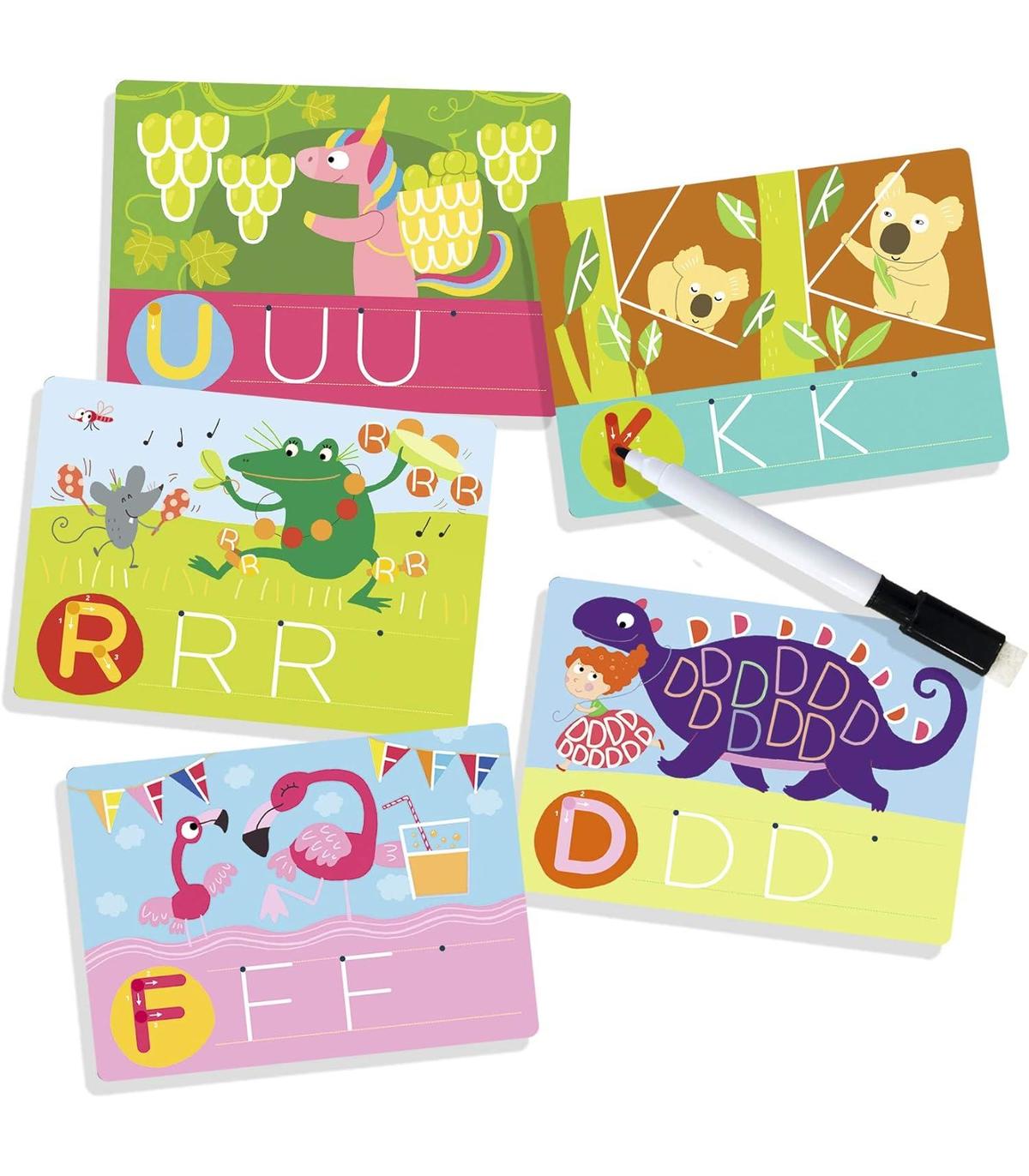 Contenido: 27 láminas borrables, 1 lámina con todo el abecedario, rotulador con borrador e instrucciones