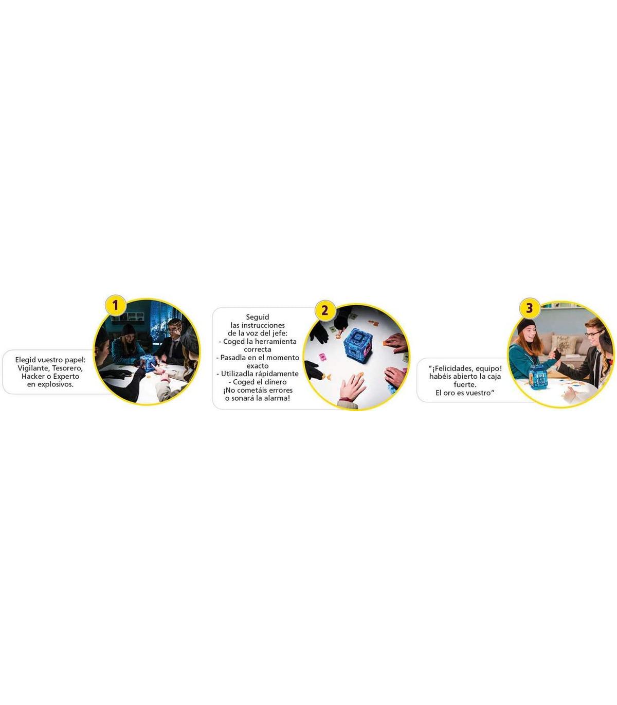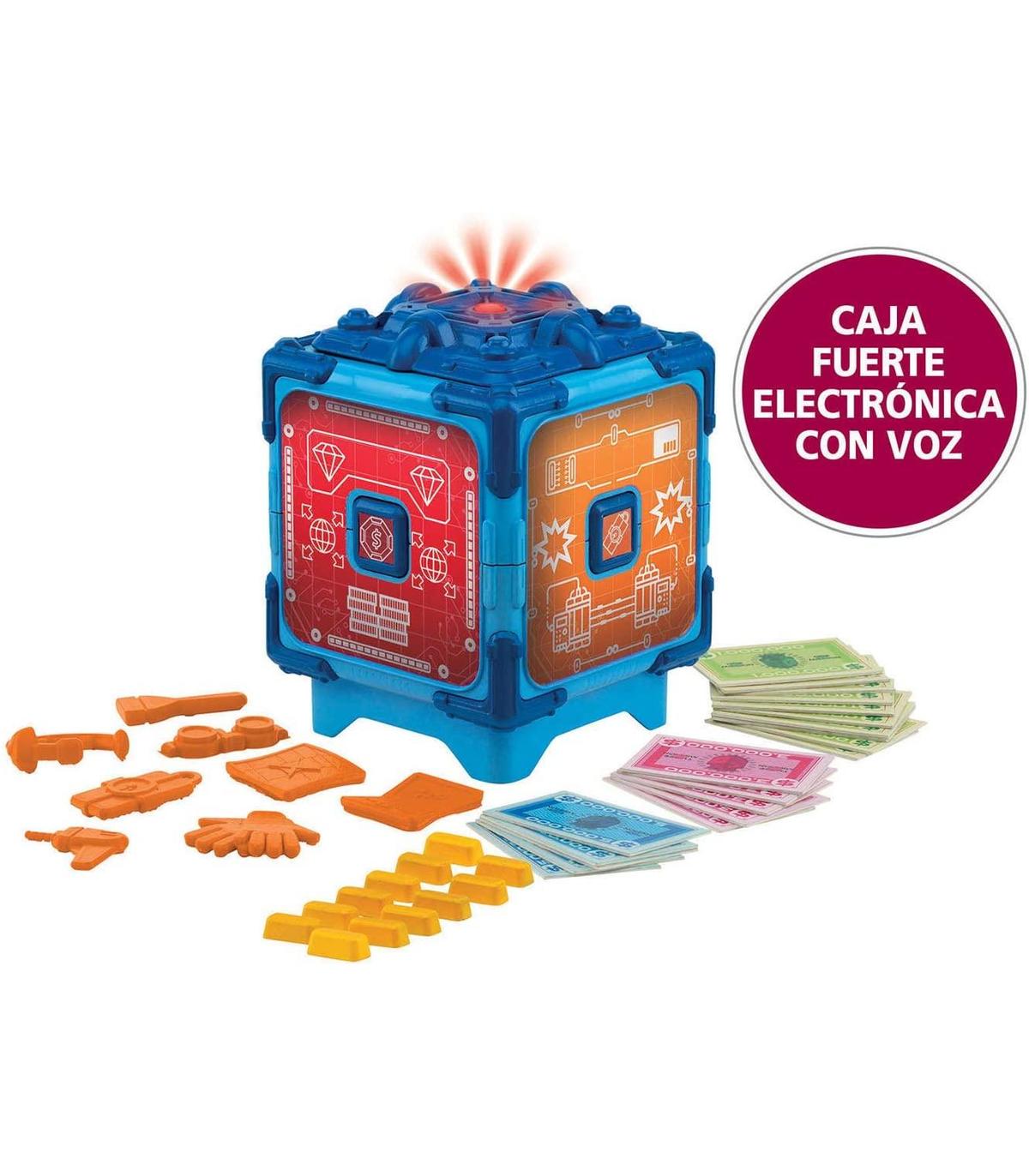 Contiene: caja fuerte electrónica, 8 herramientas de plástico, 12 barras de oro de plástico, 20 billetes de papel moneda e instrucciones; Requiere 3 pilas AAA (no incluidas)