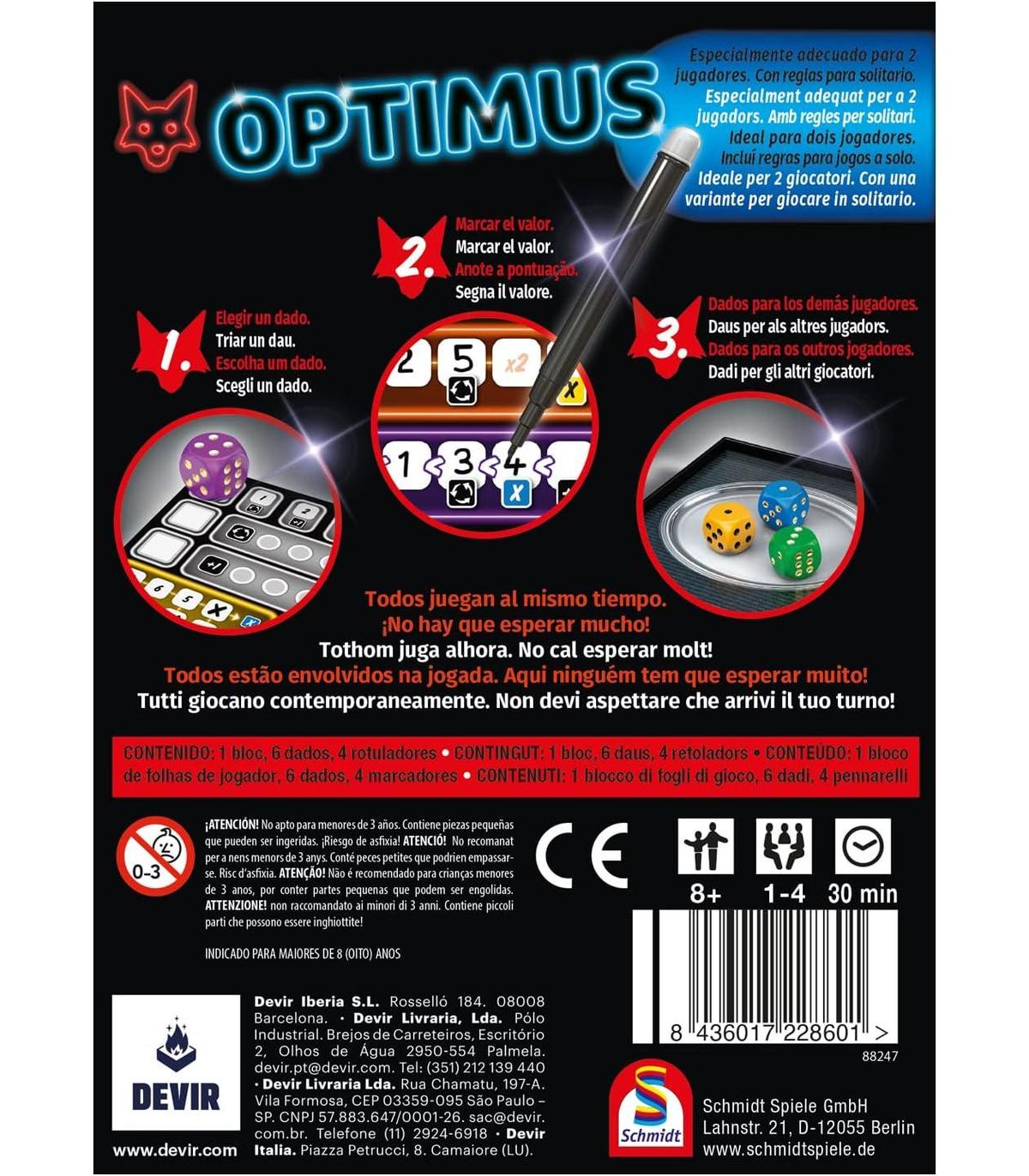 ¡Nunca unos dados, unos papeles y unos bolis habían dado tanto juego! Nominado al Mejor Juego Estratégico del año nos llega el nuevo éxito de Wolfgang Warsch, el autor más alabado del momento. Descubre Optimus, el mejor lanzer dados y escribir del mercado. Lanza los dados, escoge los que prefieras y tacha en el panel los resultados. Pero, ¡cuidado con no dejar dados valiosos para tus rivales! En Optimus, los caminos hacia la victoria son infinitos. Si haces una buena tría, ¡tu combinación puede ser la ganadora! Claves de venta: 1. Nominado al Kennerspiel des jahres. 2. El mejor lanzar dados y escribir en el mercado. 3. Perfecto en solitario, interacción explosiva en grupo. Mecánicas: 1. Lanzar dados y escribir 2. Selección de dados