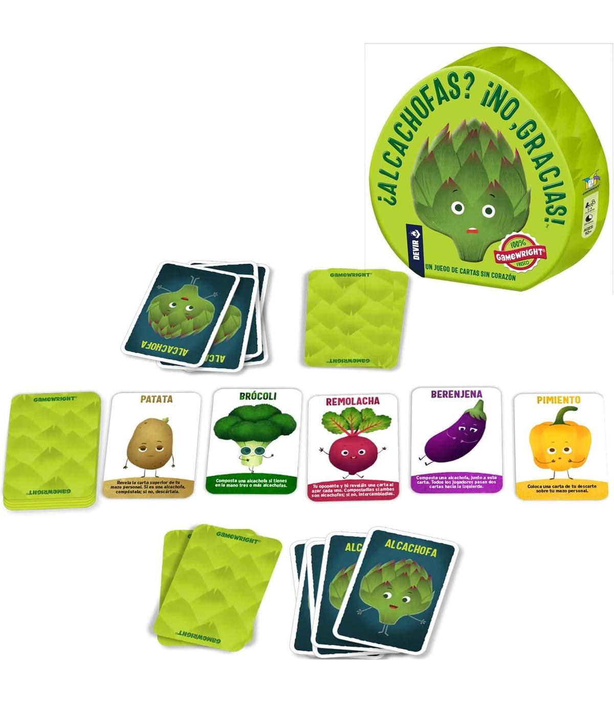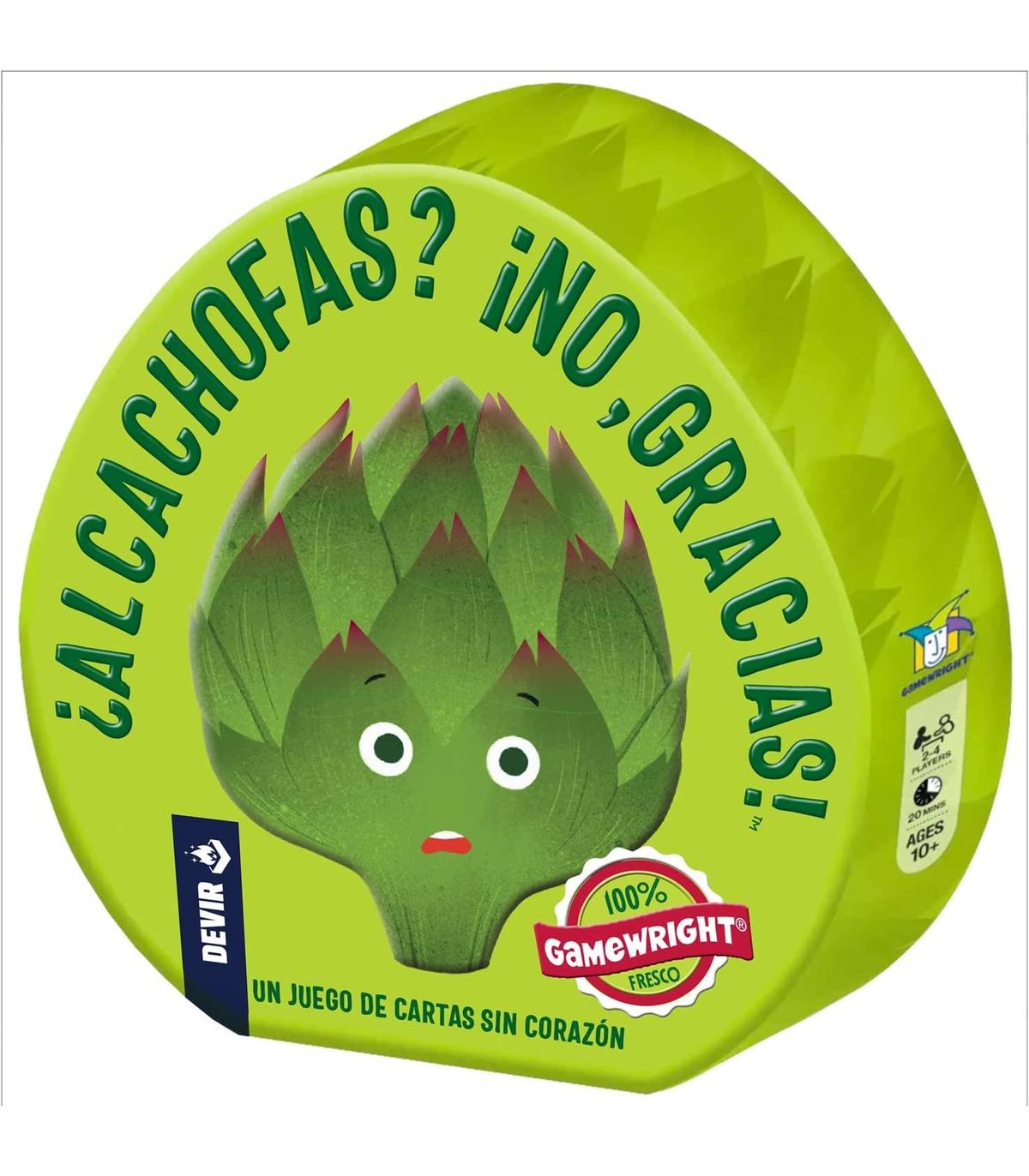 ¿alcachofas? ¡no Gracias! Un juego para iniciarse en la mecánica de construcción de mazos En formato de lata con cuna biodegradable Un juego para toda la familia con alta interacción Mecanicas: Construcción de mazos y Gestión de mano