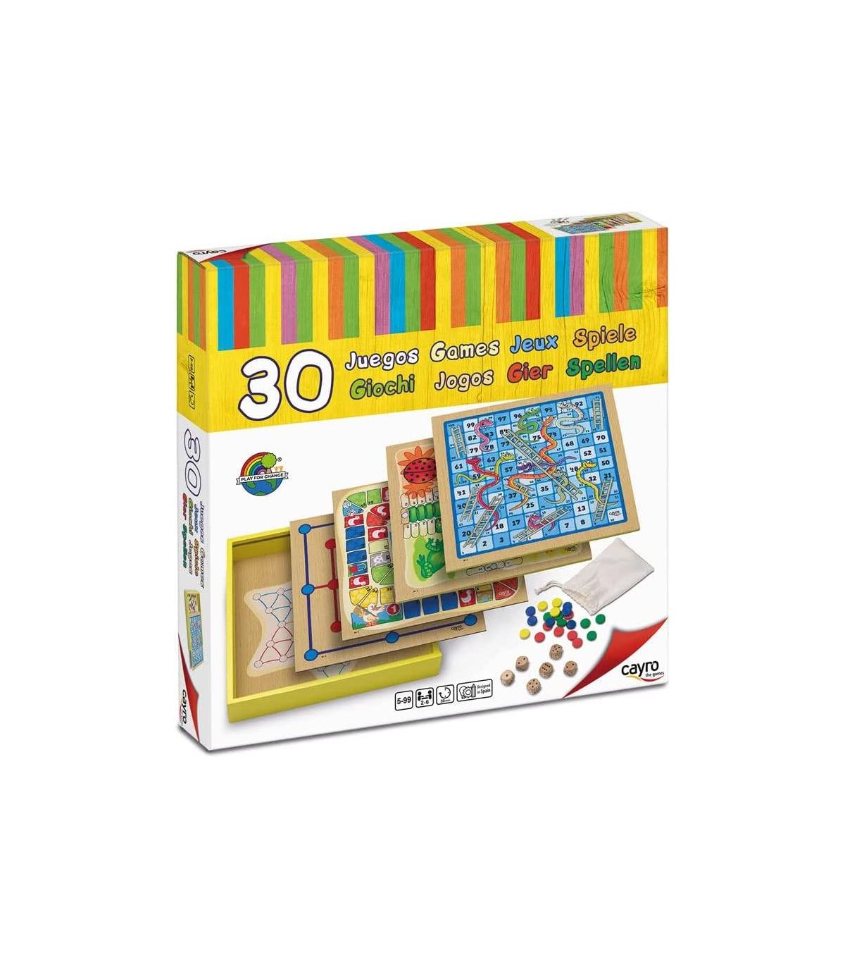 30 Juegos SELLO FSC, ECOLÓGICO Y SOSTENIBLE: Juego con sello FSC, elaborado con madera proveniente de bosques sostenibles, gestionados de manera que preservan la biodiversidad y beneficiando a las poblaciones y trabajadores locales. COMPONENTES: 4 tableros reversibles, bolsa de tela, dados de madera, pichas de madera. NIVEL: Primaria y adultos. COMPETENCIAS CLAVE - Sociales y cívicas: respetar turno, tolerancia a la frustración, comprender códigos de conducta, empatía. Aprender a aprender: escuchar normas y controlar que las están aplicando bien, percepción de autoeficacia. HABILIDADES COGNITIVAS Atención: visual a las piezas. Razonamiento: Según las premisas, deducir la respuesta correcta. INTELIGENCIAS MÚLTIPLES -Lógico-matemática ??: deducción según premisas | Espacial o visual: localizar las piezas| Interpersonal: capacidad de jugar con otras personas. DESCRIPCIÓN DEL JUEGO - Disfruta de divertidos momentos de juego con esta caja que incluye 30 juegos, todo fabricado en madera.