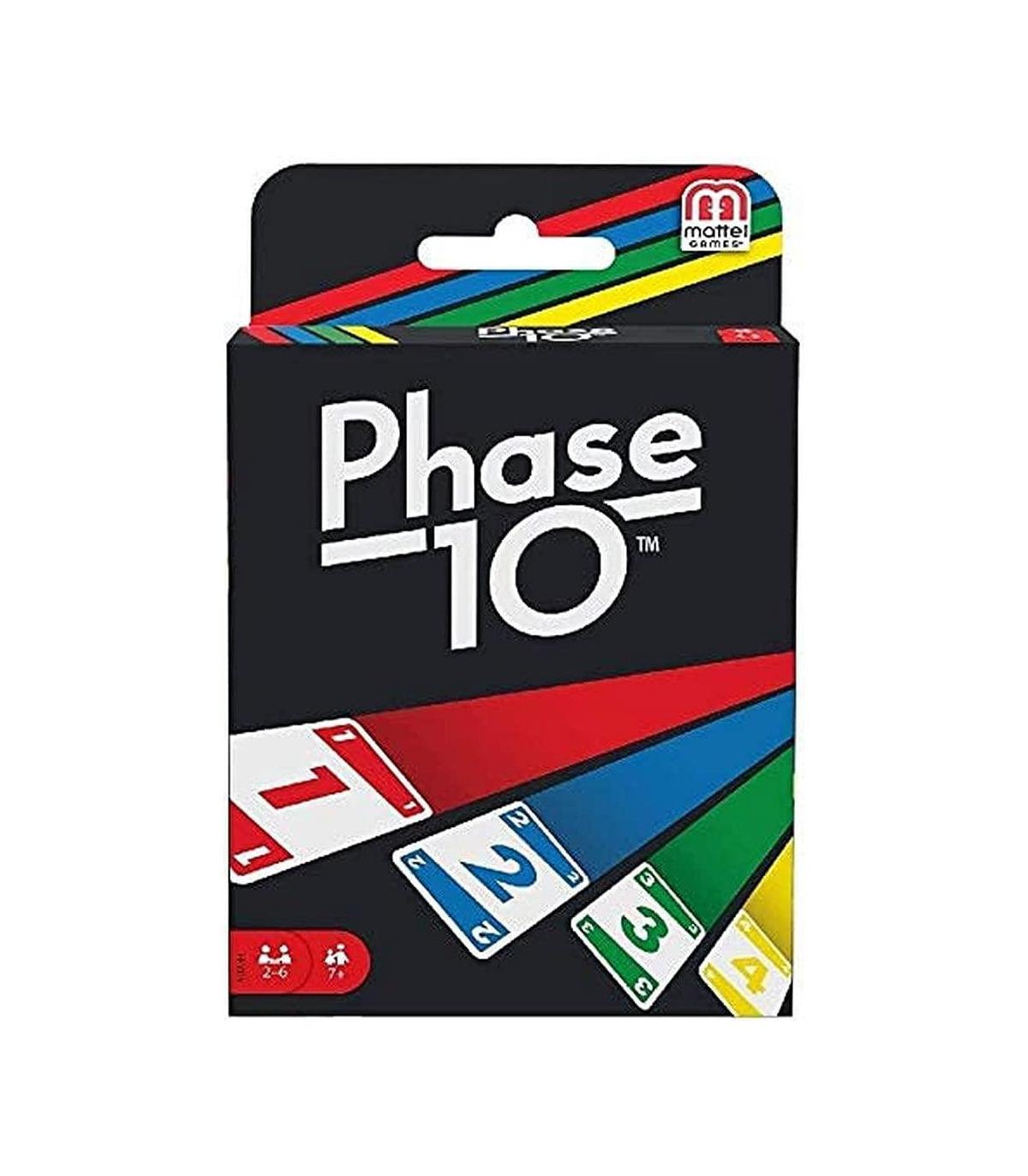 Mattel Games Phase 10 Fase 10 es un juego con las cartas del Rummy, ¡pero con un divertido giro! Sé el primer jugador en completar 10 fases diferentes con dos tríos, una escalera de siete o siete cartas del mismo color. Las fases pueden cambiar en cada turno, ¡lo que significa que cada jugador debe completar una fase antes de pasar a la siguiente! ¡Fase 10 es un divertido juego de cartas para disfrutar en familia! Incluye 108 cartas y las reglas de juego. › Ver más detalles