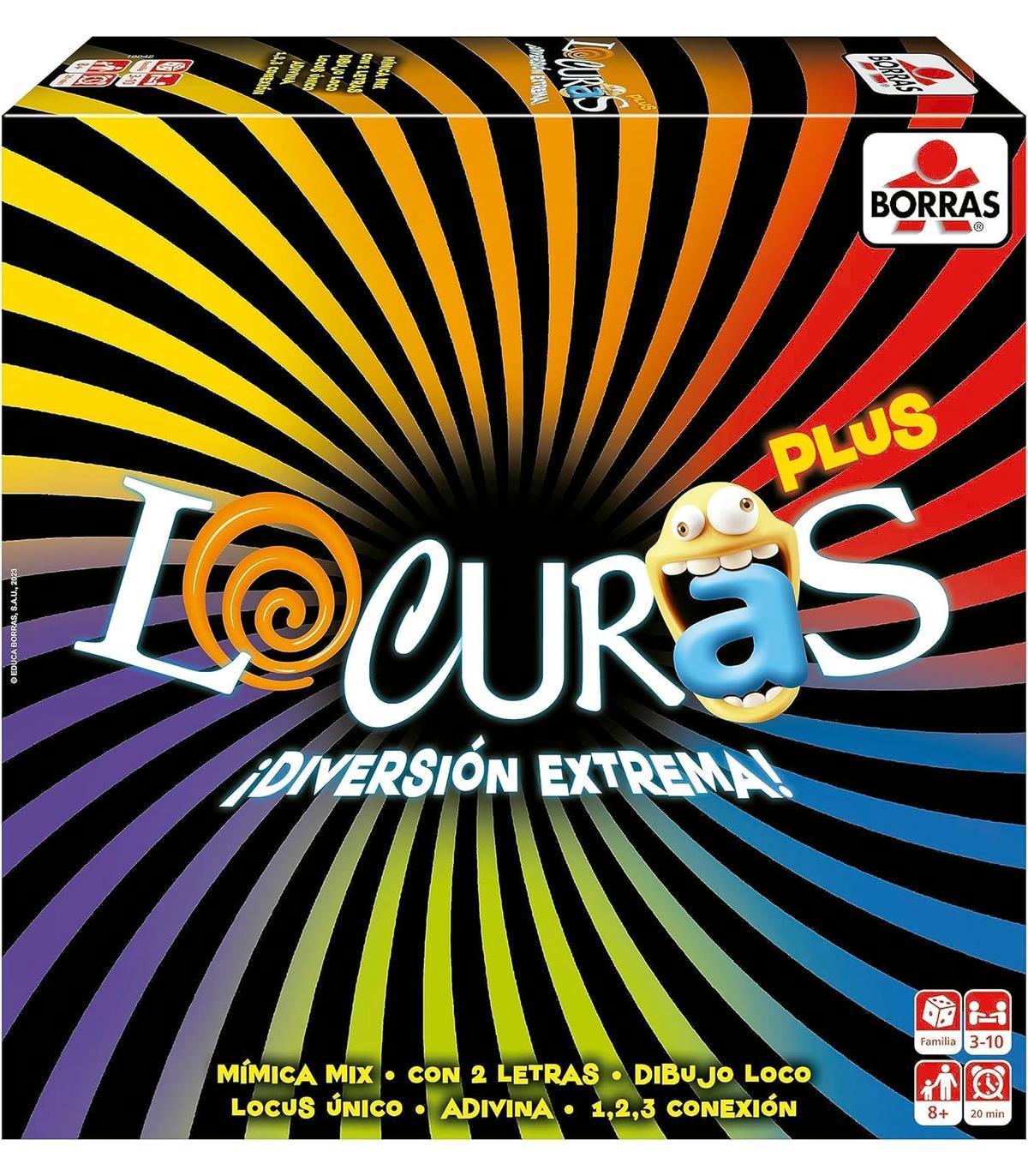 Locuras es un divertidísimo juego de mesa que combina diferentes tipos de pruebas con un punto de locura: pruebas de dibujo, auditivas, de empatía con el resto de jugadores, de mímica, acusaciones ridículas... y una gran locura final, los jugadores deberán pasar las pruebas para ser el primero en conseguir 5 Locus y así ser coronado como el nuevo Rey Loco, juego de pruebas individuales, por parejas y en grupo, contenido: 1 torre de la locura, 6 bases, 231 cartas, 10 cartas de locura final, 50 fichas de puntuación, 1 blog de dibujo, 1 lápiz, 1 dado gigante, gafas distorsionadoras, 1 reloj de arena, instrucciones, juego familiar y social para todo tipo de públicos, a partir de 8 años, juego recomendado de 3 a 12 jugadores. ADVERTENCIA: No recomendable para menores de 3 años, ya que contiene piezas pequeñas que podrían provocar asfixia en caso de ser ingeridas por el niño/a.