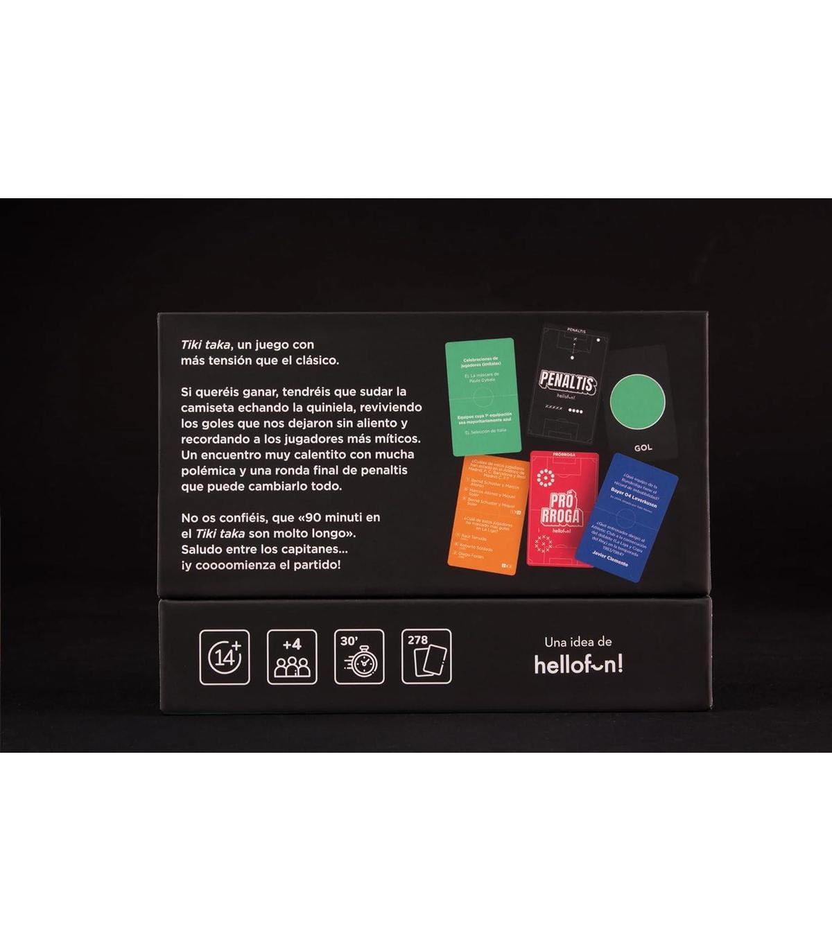 Juego Mesa Tiki Taka FÚTBOL: El juego para poner a prueba tus conocimientos sobre fútbol. Entonces... responde, adivina, compenetrate... ¡a jugar! PARA TODOS: TIKI TAKA es el juego de mesa para todos los futboleros, para jugar con los amigos, familia, compañeros, ideal para diferentes generaciones ¡Nadie se libra de disfrutar de la forma más divertida! FÁCIL: Este divertido juego tiene una dinámica muy sencilla: ve fase a fase y lee la carta de cada una de las seis categorías en el orden correspondiente. ¡Que empiece el partido! CALIDAD: Sus cartas plastificadas de alta calidad hacen que se pueda jugar en una fiesta, de viaje... Como ves, Hellofun! ha creado el juego de fútbol perfecto. EL REGALO PERFECTO: Para que la visita a tus amigos sea inolvidable.