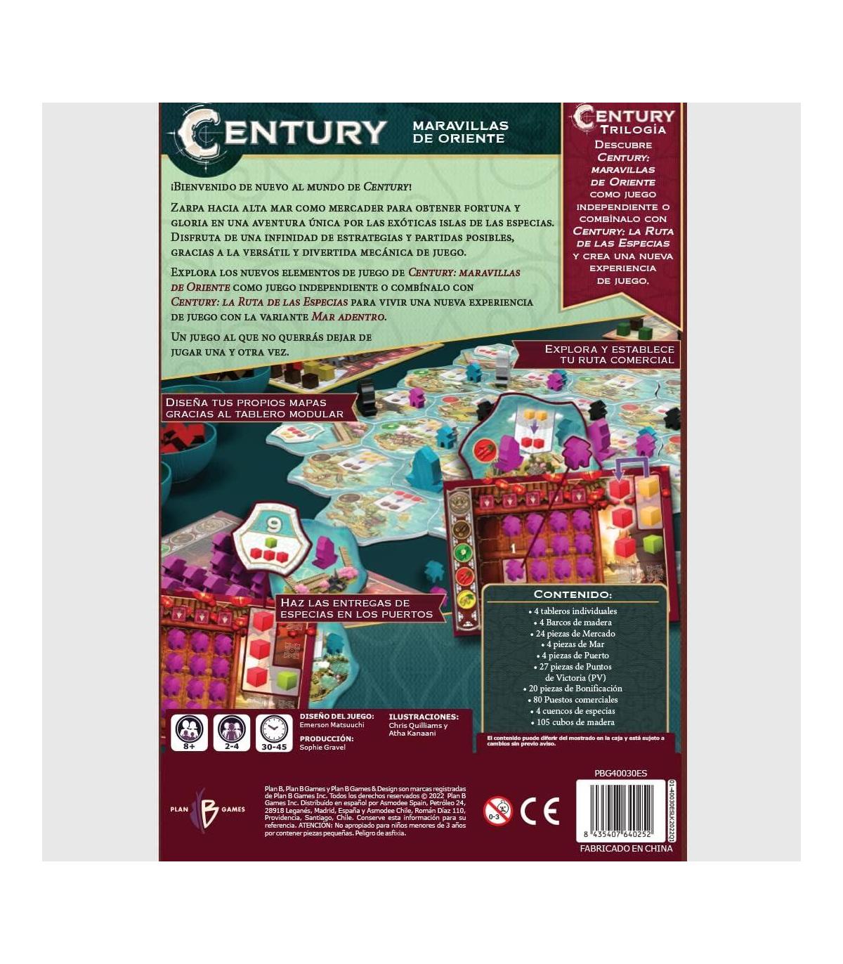 Century Maravillas De Oriente ¡bienvenido de nuevo al mundo de century! zarpa hacia alta mar como mercader para obtener fortuna y gloria en una aventura única por las exóticas islas de las especias. disfruta de una infinidad de estrategias y partidas posibles - gracias a la versátil y divertida mecánica de juego. explora los nuevos elementos de juego de century: maravillas de oriente como juego independiente o combínalo con century: la ruta de las especias para vivir una nueva experiencia de juego con la variante mar adentro. un juego al que no querrás dejar de jugar una y otra vez. descubre century: maravillas de oriente como juego independiente o combínalo con century: la ruta de las especias y crea una nueva experiencia de juego. contenido 4 tableros individuales 4 barcos de madera 24 piezas de mercado 4 piezas de mar 4 piezas de puerto 27 piezas de puntos de victoria (pv) 20 piezas de bonificación 80 puestos comerciales 4 cuencos de especias 105 cubos de madera título century maravillas de oriente referencia pbg40030espt fecha de lanzamiento 17 - 06 - 2022 editorial plan b games categoría juego de tablero colección century idioma spanish - portuguese edad mínima recomendada 8 años duración 30 - 45' número de jugadores 2 a 4