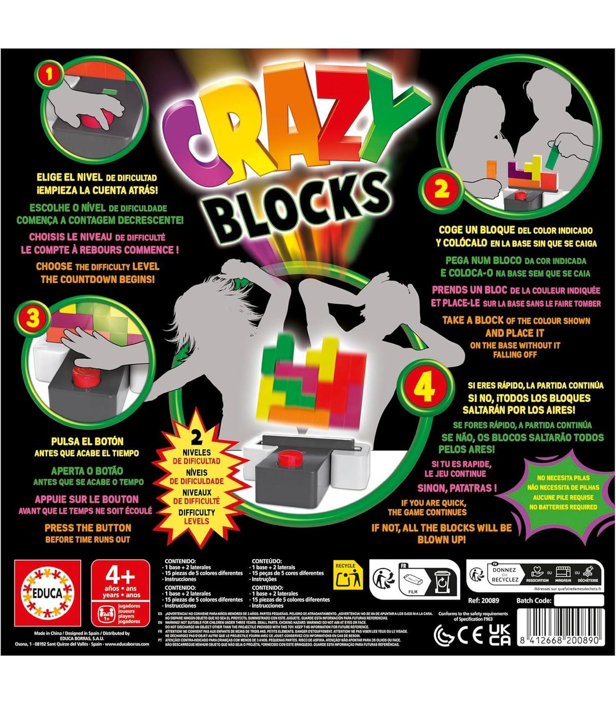 Crazy Blocks ¡O eres rápido colocando bloques o saltarán por los aires! Contenido: - 16 bloques de colores - Base de juego - Instrucciones Crazy Blocks el juego más explosivo basado en el tradicional juego Tetris, es un juego de construcción interactivo que desarrolla la vivacidad y la destreza.