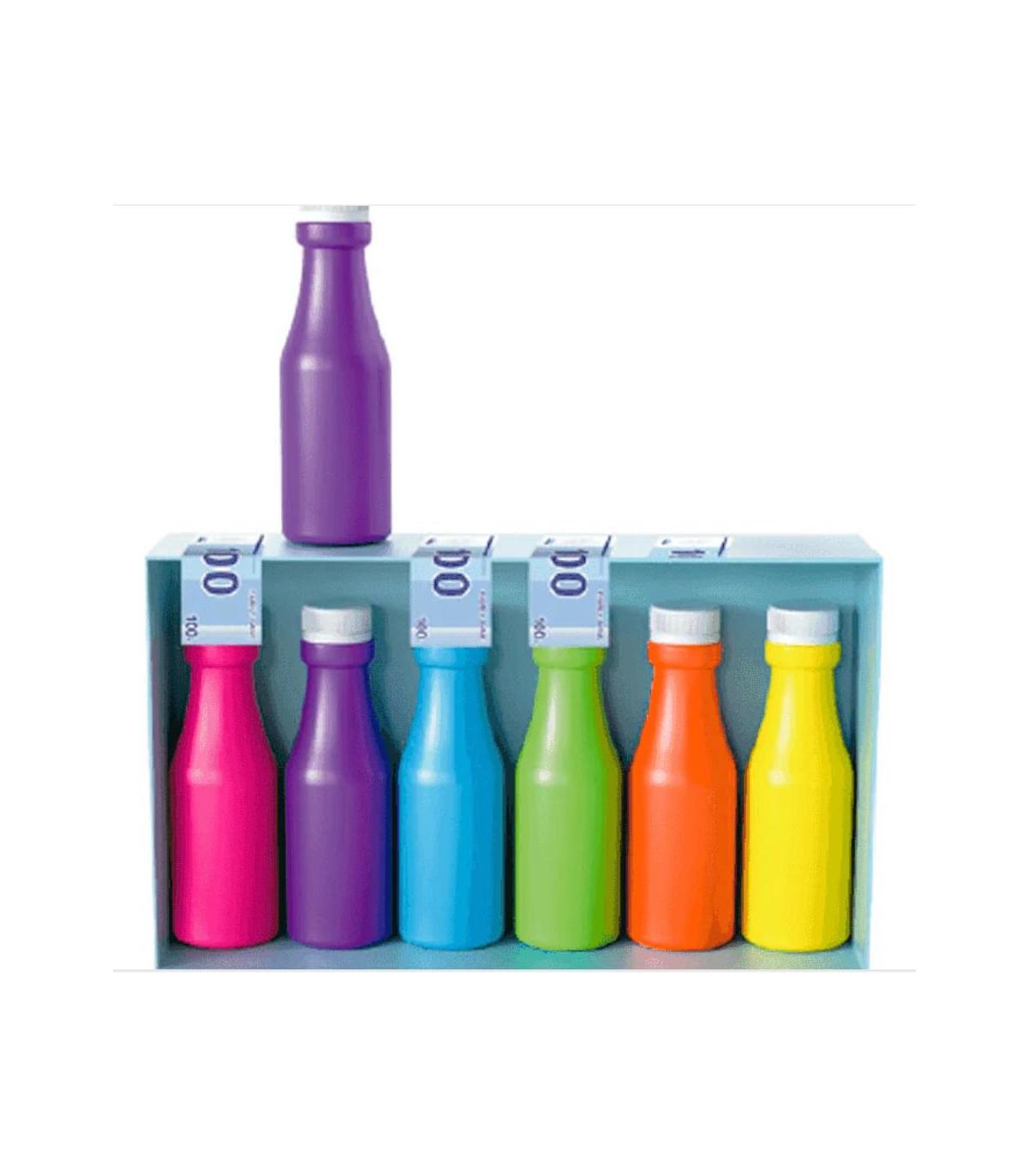 Reto rápido: Baraja las botellas sobre la mesa y cuenta hasta tres. Todos los jugadores deben emparejar los colores lo más rápido posible. ¡Quien termine primero gana un billete de puntuación!
