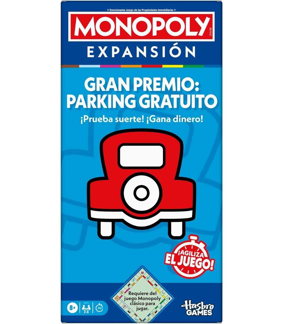 Monopoly Expansion Gran Premio: Parking Una otra manera de jugar el clásico juego Monopoly: dale un toque dinámico al juego Monopoly y juega en menos tiempo con esta expansión: parking gratuito; esto es una expansión, no un juego completo (requiere del juego Monopoly clásico para jugar; se vende por separado) Tarda mucho menos tiempo en jugar: juega el juego de mesa familiar Monopoly en tan solo 40 minutos con esta expansión fácil de aprender y de jugar; es óptimo para divertirse y reírse con la familiar y amigos en cualquier ocasión Una regla casera favorita ahora es una realidad: conecta esta expansión al juego Monopoly y disfruta del clásico juego que todos conocen, pero con un nuevo giro; transforma el Parking gratuito en una ruleta para ganar el gran premio Gira la ruleta para intentar ganar el gran premio: en esta divertida extensión del juego familiar, las casillas de Suerte y Caja de comunidad ahora son casillas de Giro; los jugadores que caigan en estas casillas pueden girar la ruleta para intentar ganar el gran premio Conduce la limusina: la ruleta y cartas de bonificación permiten que los jugadores con suerte cambien su peón por la limusina; al conducirla, podrán obtener propiedades gratis sin pagar la renta