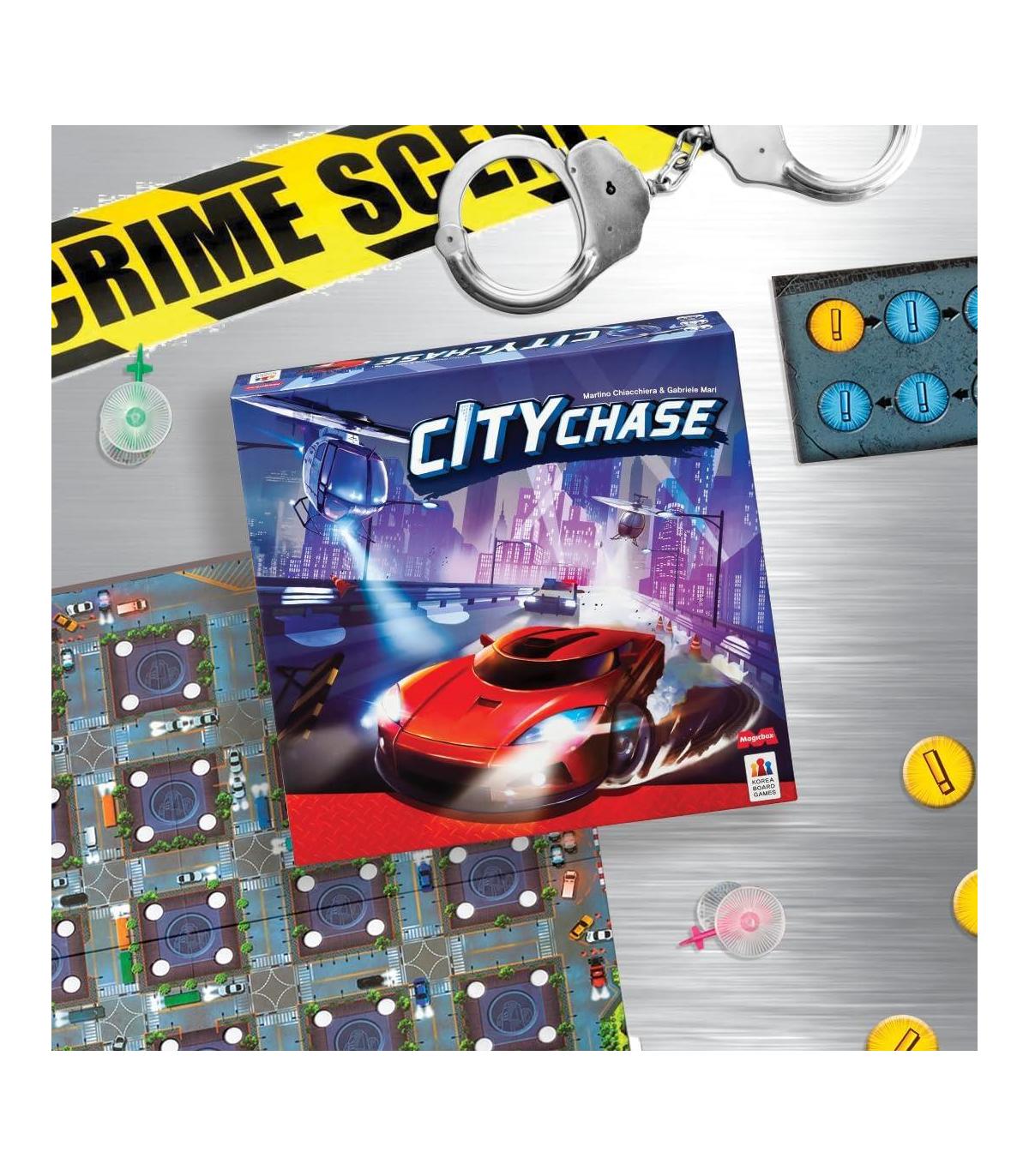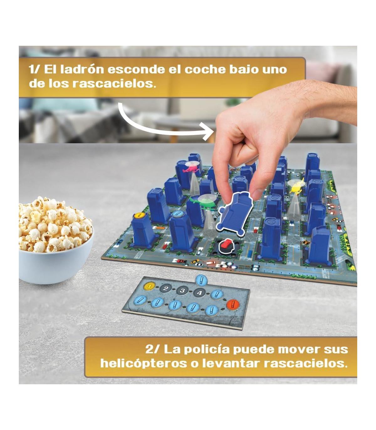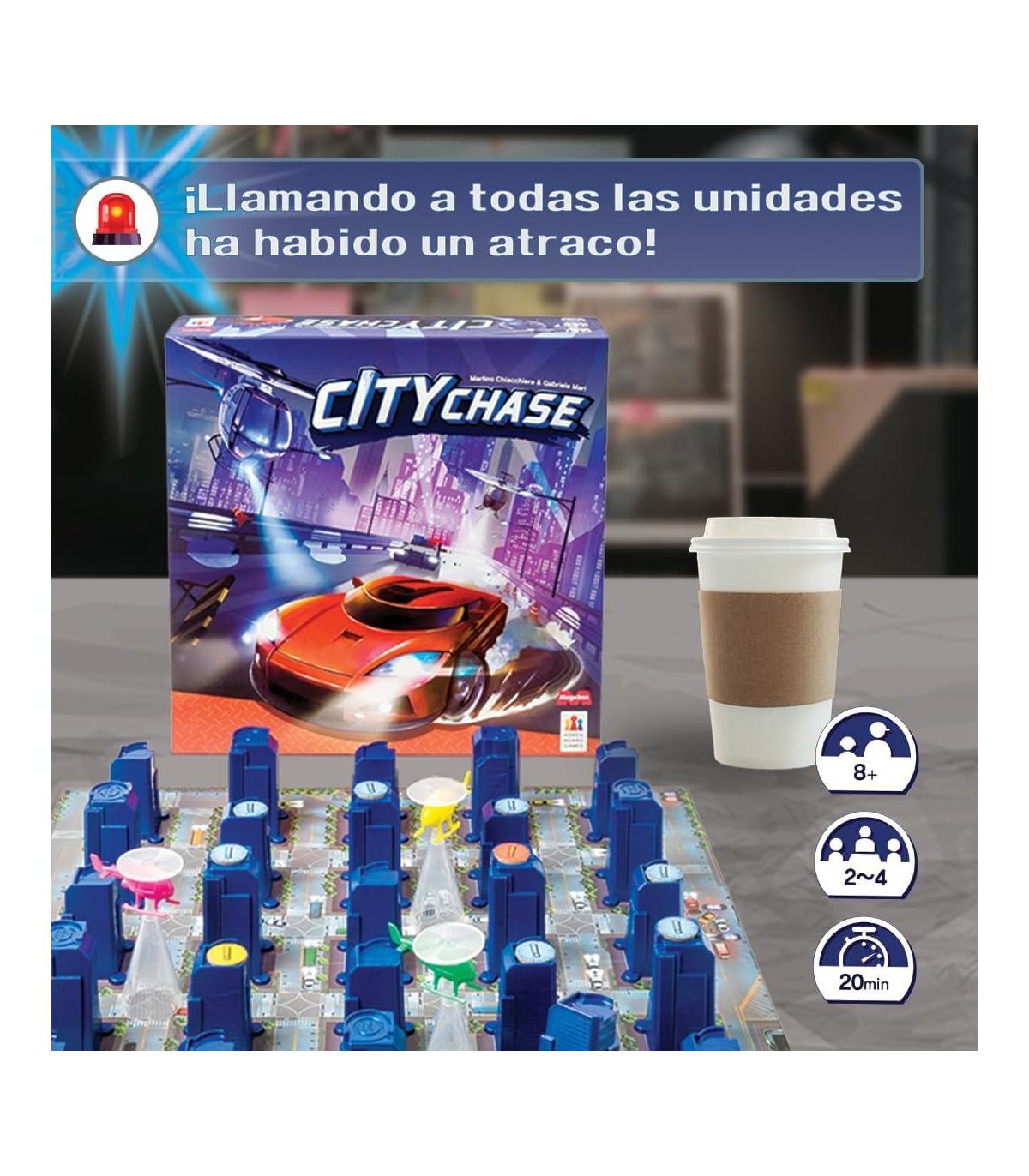 Game - City Chase 1x4 (v.0) ¡LLAMANDO A TODAS LAS UNIDADES! - El ladrón se esconde en uno de los edificios. Los helicópteros de la policía patrullan por las calles para rastrear y detener la fuga. ¿Arrestará la policía al ladrón o logrará escapar? ¡HA HABIDO UN ATRACO! - El ladrón esconde el coche bajo un rascacielos mientras los policías cierran los ojos ¡COMIENZA LA PERSECUCIÓN! - La policía puede mover los helicópteros y también levantar edificios en busca de rastros ¿QUIÉN GANARÁ? - Si la policía da con el coche antes de la definitiva ronda 11, gana. De lo contrario, gana el ladrón NÚMERO 1 EN VENTAS EN JAPÓN – City Chase, un juego asimétrico (1 jugador contra el resto) que garantiza tensión, intriga y diversión. Llega a España tras ser número 1 en ventas en el país nipón