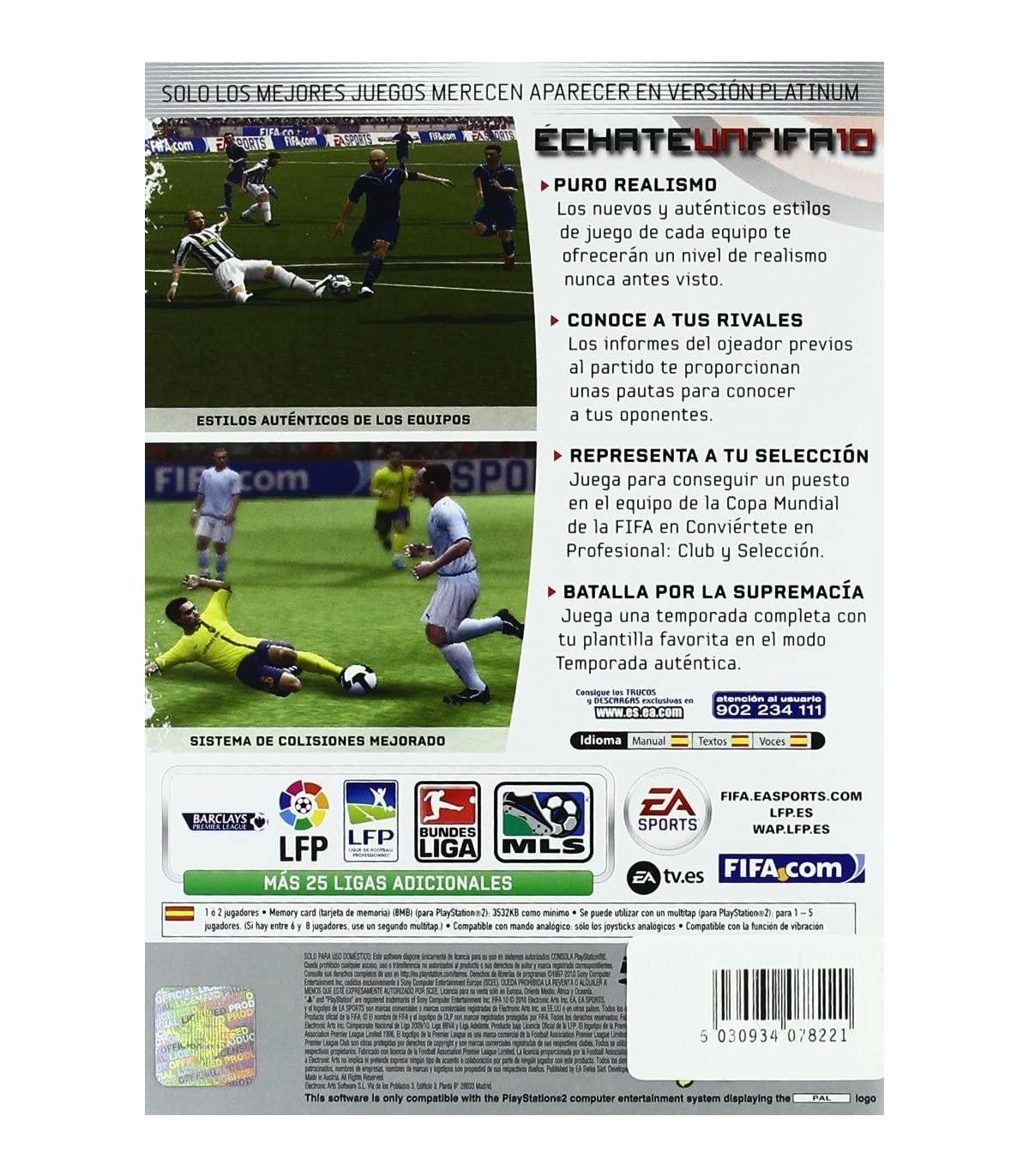 Después de ganar 25 premios internacionales con FIFA 09, la franquicia de fútbol superventas de EA SPORTS? se supera con FIFA 10. Atendiendo a las opiniones de los consumidores tras más de 275 millones de partidos online jugados, FIFA 10 mejora su ya potente motor de juego y se centra en lo que más interesa a sus seguidores: JUGABILIDAD. En esta nueva edición de FIFA 10 se ha perfeccionado la jugabilidad mejorando la inteligencia artificial y capacidad de respuesta; además se ha incluido un modo Manager revisado a fondo en el que se han realizado más de 50 grandes mejoras. Estas y otras mejoras proporcionan un nuevo estándar de realismo en fútbol virtual ya que FIFA 10 continúa siendo el referente en cuanto a innovación y jugabilidad, convirtiéndose en el simulador de fútbol más completo. Sobre el terreno de juego se han mejorado los fundamentos de este deporte garantizando así que FIFA 10 sea el reflejo del auténtico mundo del fútbol, lo que se traduce en un control del balón más avanzado y una mayor interacción física. Al atacar, los jugadores ahora analizan el espacio con mayor eficacia, corren y se abren intentando permanecer en posición legal, inventan líneas de pases con naturalidad y crean gran variedad de opciones de ataque. Al defender, los nuevos conceptos como la prioridad posicional permiten a los defensas realizar varias jugadas al mismo tiempo; los huecos peligrosos son cubiertos por los compañeros que están fuera de su posición. Asimismo, las entradas, la presión en los marcajes y los despejes rápidos son las nuevas opciones que hacen que defender sea una habilidad táctica en FIFA 10. Las siguientes novedades introducidas cambiarán la forma de controlar a los jugadores de FIFA 10. El primer y único sistema de regate de 360° ofrece a los jugadores un mayor control del balón y les permite encontrar espacios entre la defensa, algo que antes resultaba imposible. Mediante una nueva tecnología de animación, los maestros del regate ahora podrán encarar a un defensa y usar el regate lateral de gran precisión para superarle. El innovador concepto "Libertad de juego físico" hace posible que los jugadores realicen regates más amplios con un solo toque; El nuevo sistema de lucha cuerpo a cuerpo genera una mayor pugna por la posesión del balón entre el regateador y el defensa, menos predecible y más variada. Una edición más lograda del siempre popular modo Manager incluye más de 50 grandes mejoras, así como un mayor realismo durante los partidos, traspasos de jugadores basados en la toma de distintas decisiones y curvas de crecimiento del jugador fieles a la realidad. ? Sistema de regate de 360° ? Es el primer y auténtico sistema de regate de 360° que ofrece un mayor control del balón y permite a los jugadores encontrar espacios entre la defensa, algo que antes resultaba imposible. ? Maestros del regate ? La nueva tecnología de sincronización de la animación permite tener un control sin precedentes. Los maestros del regate ahora podrán encarar a un defensa y usar el regate lateral de gran precisión para superarle. ? Libertad de juego físico ? Regates más amplios con un solo toque y un sistema de lucha cuerpo a cuerpo que permiten una mayor pugna por la posesión del balón entre el regateador y el defensa, menos predecible y más variada. ? Anticipación del jugador(Situaciones de Urgencia) ? Las mejoras realizadas en cuanto a la anticipación y lógica de la Inteligencia Artificial, con unos 50 nuevos ciclos de movimientos, permiten un posicionamiento más preciso para que los jugadores se concentren en el balón y se muevan a la velocidad que requiere la acción. ? Mejoras en el control y recepción del balón ? Los jugadores ahora son más conscientes de dónde se encuentra la posición más natural y cómoda para poder hacerse con el balón en el campo y controlarlo antes y con mayor facilidad. ? Posicionamiento avanzado ? Los defensas realizan varias funciones al mismo tiempo y juegan en el campo con mayor inteligencia; los huecos peligrosos son cubiertos por los compañeros que están fuera de su posición. Al atacar, los jugadores analizan el espacio con mayor eficacia, corren y se abren permaneciendo en posición legal, inventan líneas de pases y varían sus opciones de ataque. ? Pases más precisos ? Los jugadores estudian mejor los espacios y de ese modo localizan con toda precisión los pases y dan a sus receptores más opciones y tiempo para superar la presión defensiva. ? Tiros a puerta realistas ? Los ajustes realizados en el sistema de disparo y las modificaciones hechas en la física del balón permiten una mayor variedad de disparos más realistas. ? Más opciones de defensa ? Se han mejorado las entradas con el fin de que los jugadores con mayor técnica lleguen mejor y eviten derribar al regateador. Las mejoras en la lógica de los despejes permiten a los defensas tener más opciones de llegar al balón antes que el rival. El esfuerzo de los defensas por evitar oportunidades de gol se ve en las entradas a ras del suelo para impedir los centros y en los despejes de chilena. ? Ajustes en la Inteligencia Artificial del portero ? Las numerosas mejoras han hecho que los porteros ahora se anticipen antes y tengan una percepción mejor de dónde deben interceptar los balones perdidos, dando lugar a un sistema de anticipación más preciso y potente La novedosa tecnología de sincronización de la animación hace que el posicionamiento y velocidad del portero sea fiel a este deporte y, por tanto, aumenten las distintas oportunidades de gol. ? Autenticidad del modo Manager ? Se han realizado más de 50 grandes mejoras para poder ofrecer toda una experiencia de juego que refleje el auténtico mundo de este deporte. Los resultados de los partidos se basan en las fortalezas y debilidades de jugadores y equipos. Los traspasos de jugadores se deciden según distintos criterios y decisiones, como el prestigio y las finanzas