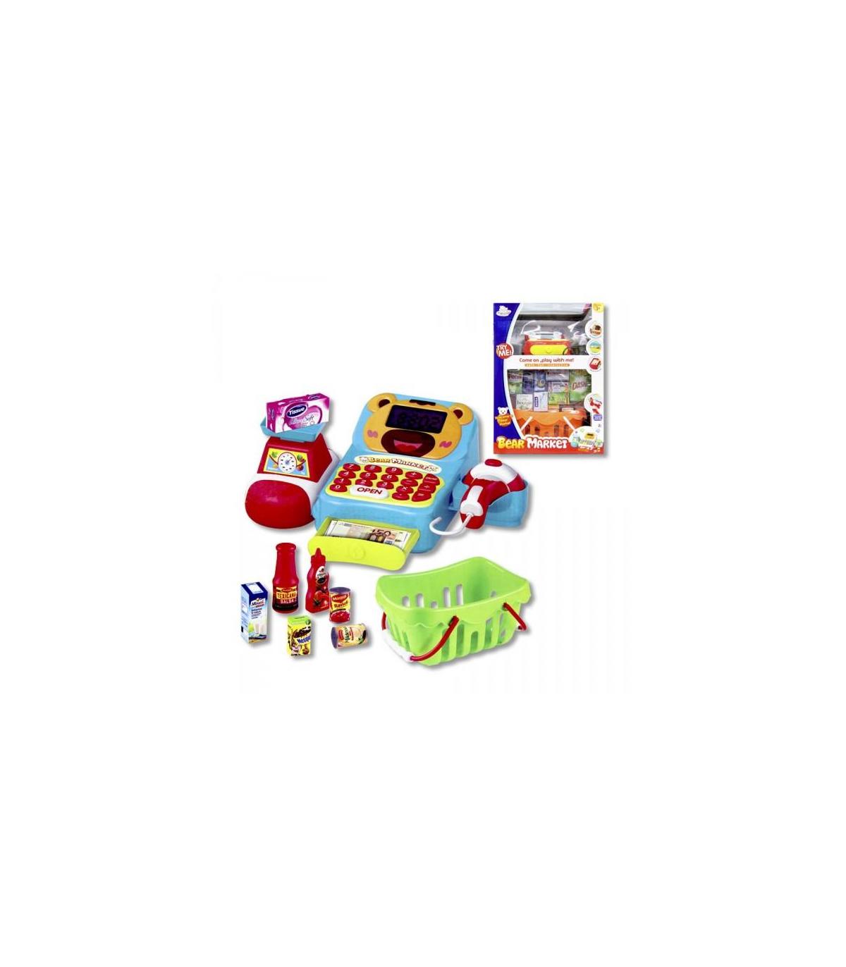 Caja registradora electrónica de color roja con peso, pistola lectora de códigos de barras y cajón. Incluye complementos para hacer la compra como en el supermecado de verdad con cesta, alimentos y mucho más. Medidas: 31 x 43 x 21 cm. Funciona con 3 pilas 1,5V AA incluidas.