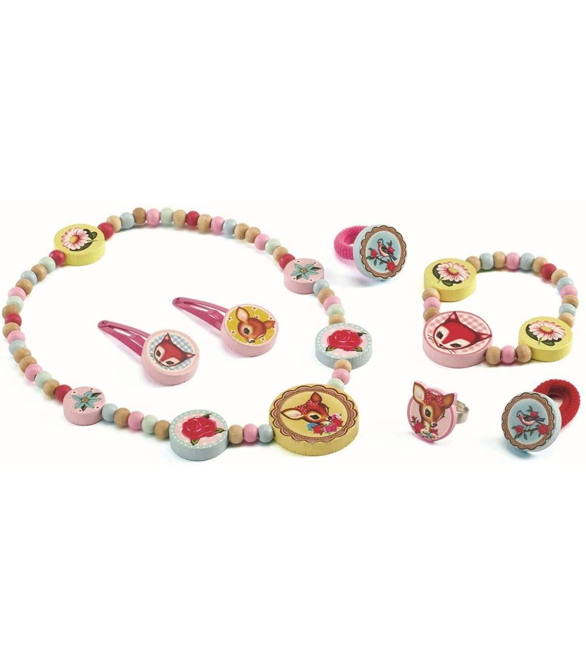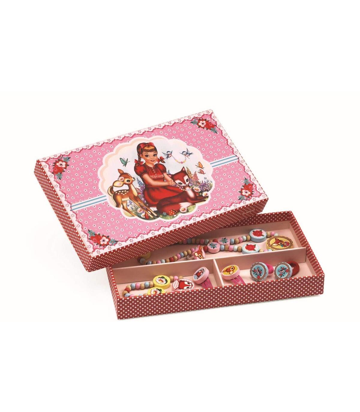 La joyería pequeña Doe por Djeco Una colección divertida y colorida de la joyería hermosa que viene en una bonita caja. Contiene un collar un anillo dos hairclips dos motas de pelo y una pulsera. Diseñado por Fiona Hewitt. Adecuado De 4 a 12 años Dimensiones de la caja 22 x 14 x 3 cm
