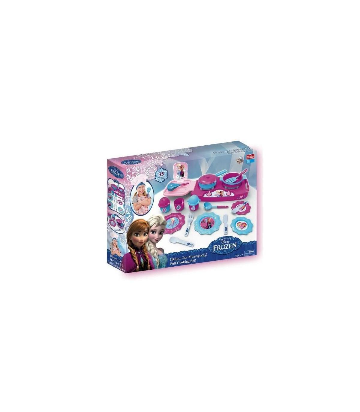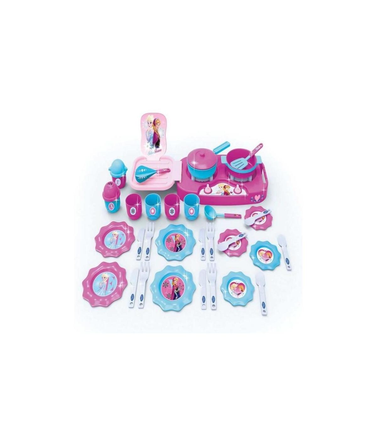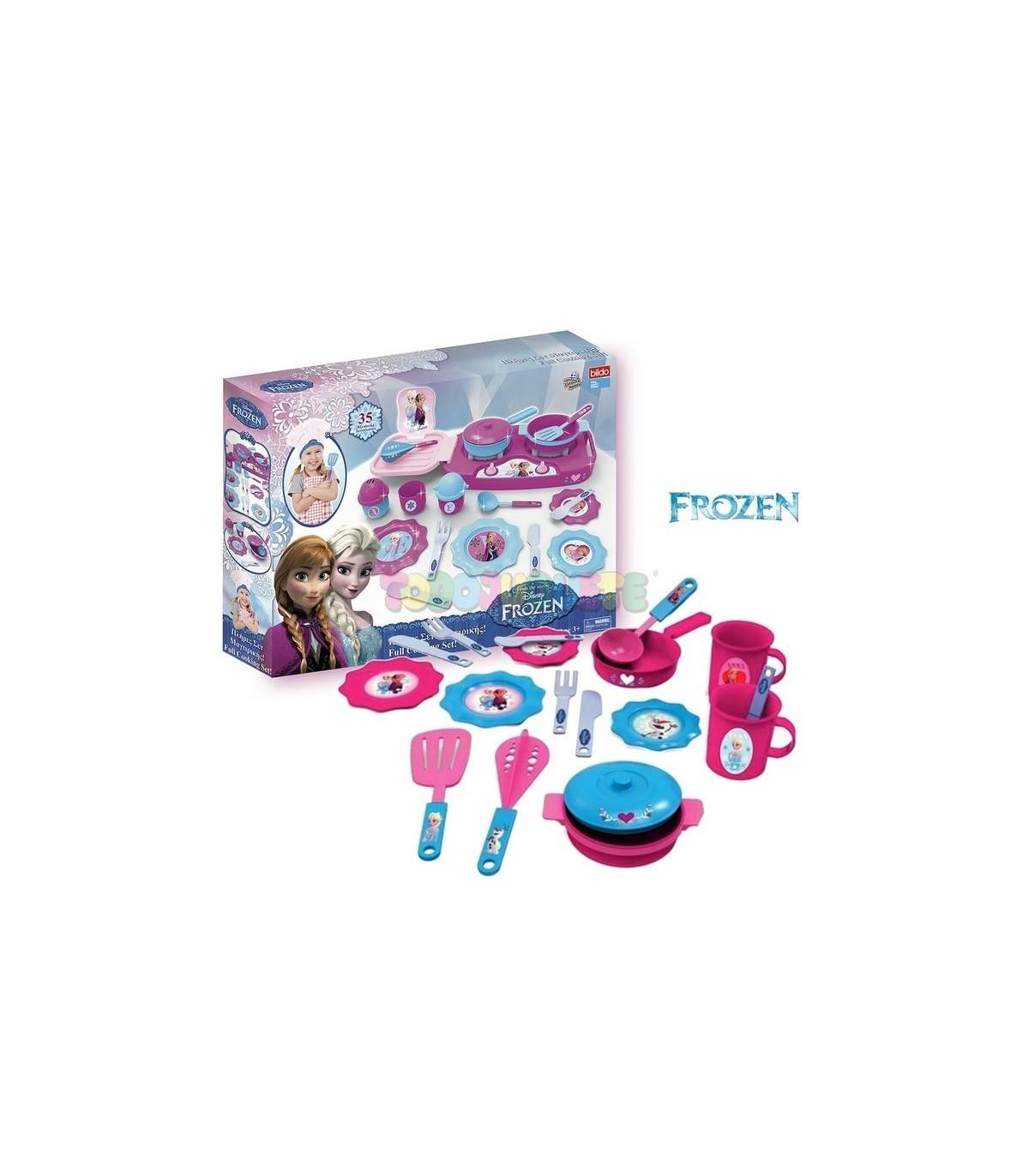 Este fantástico set de cocina de tus princesas favoritas tiene todos los detalles para que te sientas en el mundo de Frozen y puedas jugar a las cocinitas, la cocina tiene colores azules y rosas, con las caras de las princesas Ana y Elsa. Incluye 35 bonitos accesorios, además tiene fogones para que puedas calentar la comida en la cacerola y sartén de juguete que vienen incluidas. ¡Para pequeños chefs! Incluye 35 accesorios, ¡Cocinita súper completa!