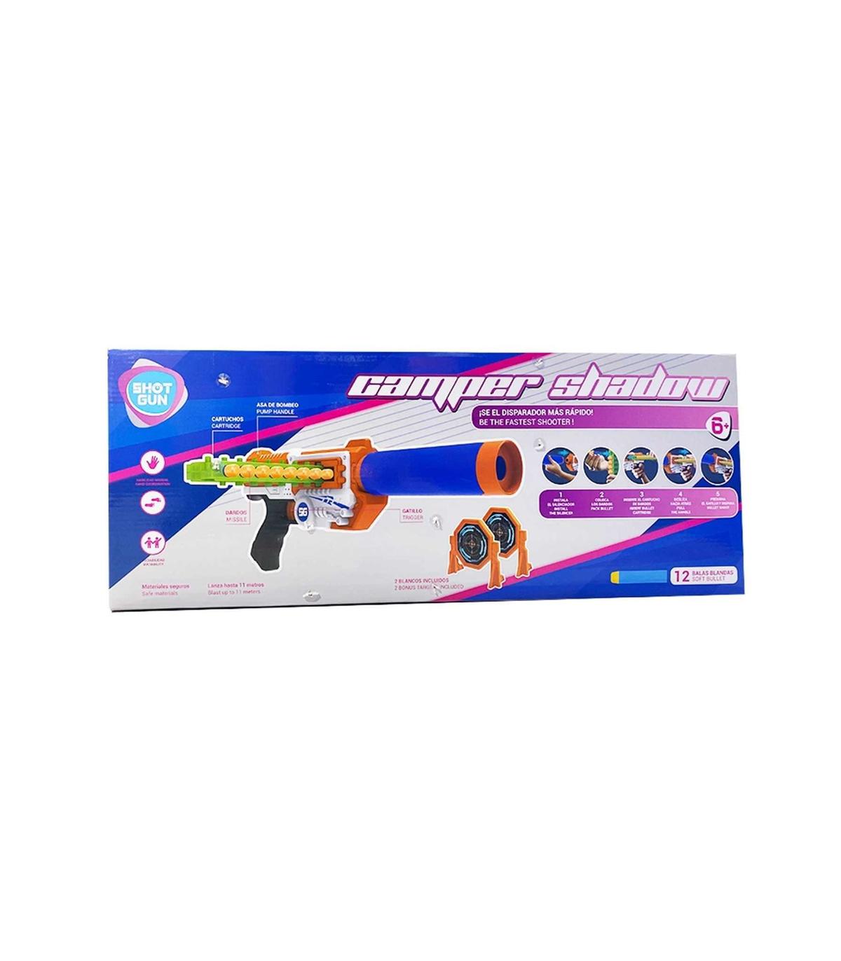 Fusil Shot Gun Camper Shadow. Sé el disparador mas rapido. A partir de 6 años. Con silenciador incorporado. Coloca los dardos en el pack bullet, inserta el cartucho laterial, desliza hacia atras y a disparar. Incluye: Cargador Lateral, 2 Dianas para tiro y 12 Dardos. Material Seguro. Alcanza los 11 metros.