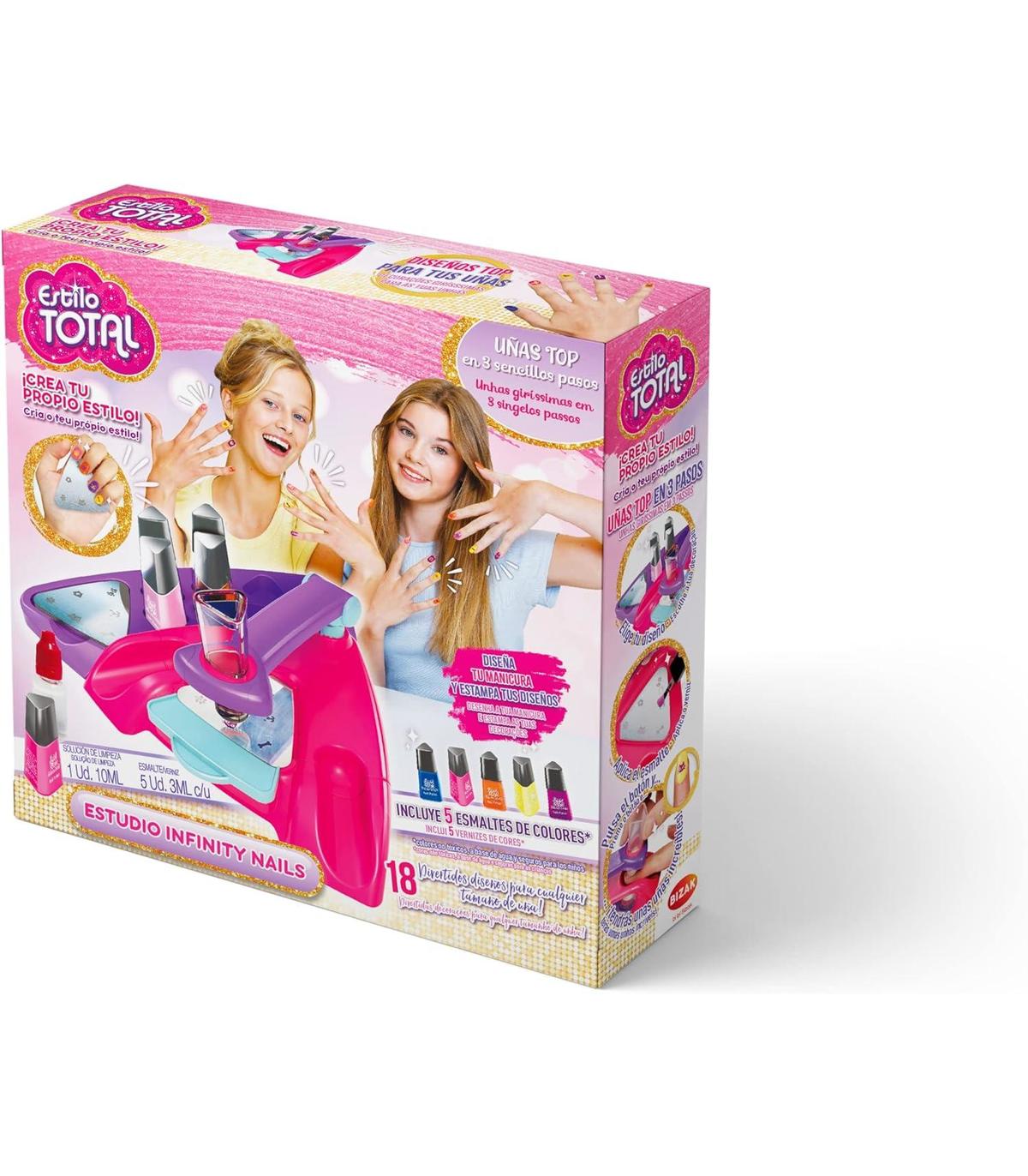 ¡Lucirás unas bonitas uñas! Incluye: 3 plantillas (18 diseños), 5 esmaltes de colores, 1 estampador, 1 rasqueta, 1 solución de limpieza y 1 estudio.