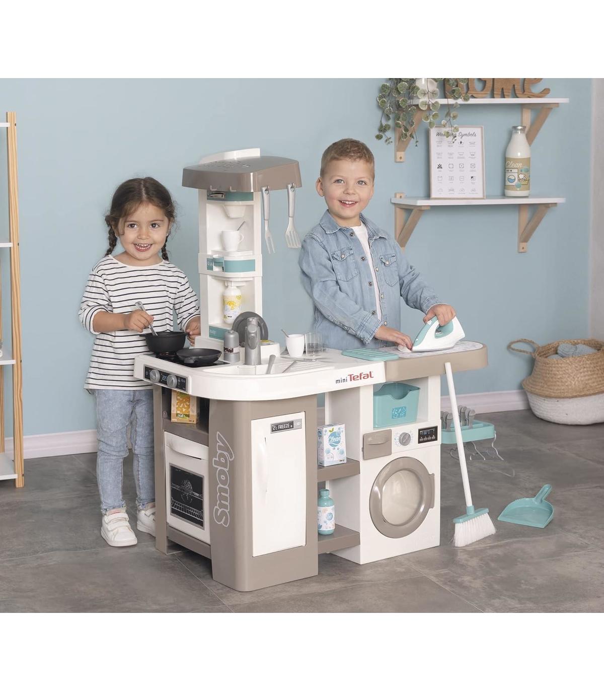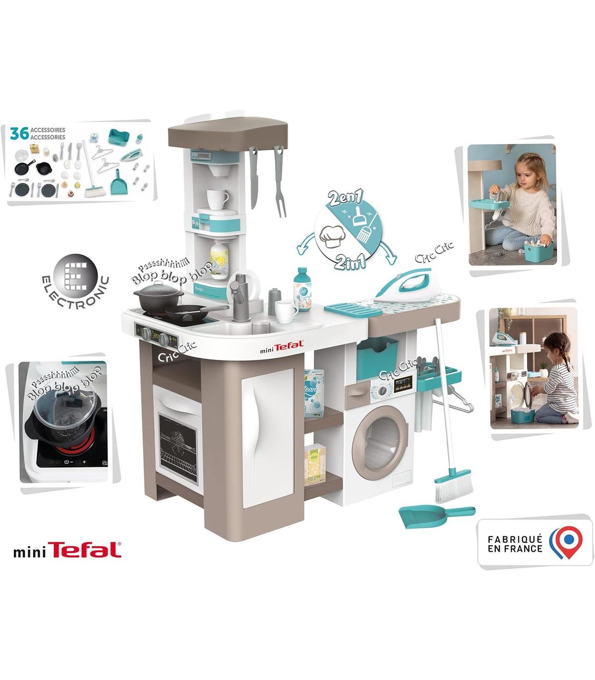 Cocina Cleaning Cocina licencia Tefal 2-en-1: área de cocina y área de limpieza Área de cocina con fregadero, horno, nevera, cafetera, campana y múltiples accesorios para cocinar El área de limpieza está compuesto por una lavadora con un cajón con 2 compartimentos, una puerta abatible y función "cric cric", tendedero, una cesta de dos asas y una tabla de plancha 36 accesorios incluidos: sartén, cubiertos, vajilla, salero, pimentero, cápsulas de café Adecuado a partir de 3 años
