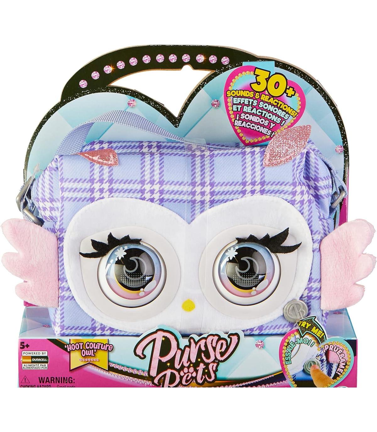 BOLSO NIÑA Y MASCOTA INTERACTIVA: el peluche interactivo de Purse Pets está hecho de una tela acolchada y suave, unos ojos inspirados en el arte pop y una correa ajustable. El Hoot Couture Owl de Purse Pet es tendencia en mascotas y accesorios de moda. ¡Colecciona todos los modelos de bolsos para niñas Purse Pets