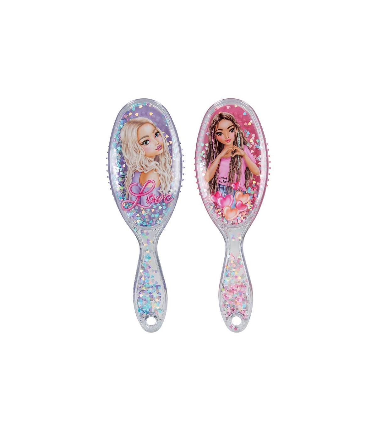 ¡Qué cool es el confeti! Los cepillos de pelo transparentes de TOPModel están llenos de confeti con forma de corazoncitos que parecen bailar alegremente con cada movimiento del cepillo. Disponibles dos diseños con motivos de guapísimas modelos, almohadilla de goma suave y cerdas de plástico flexibles.