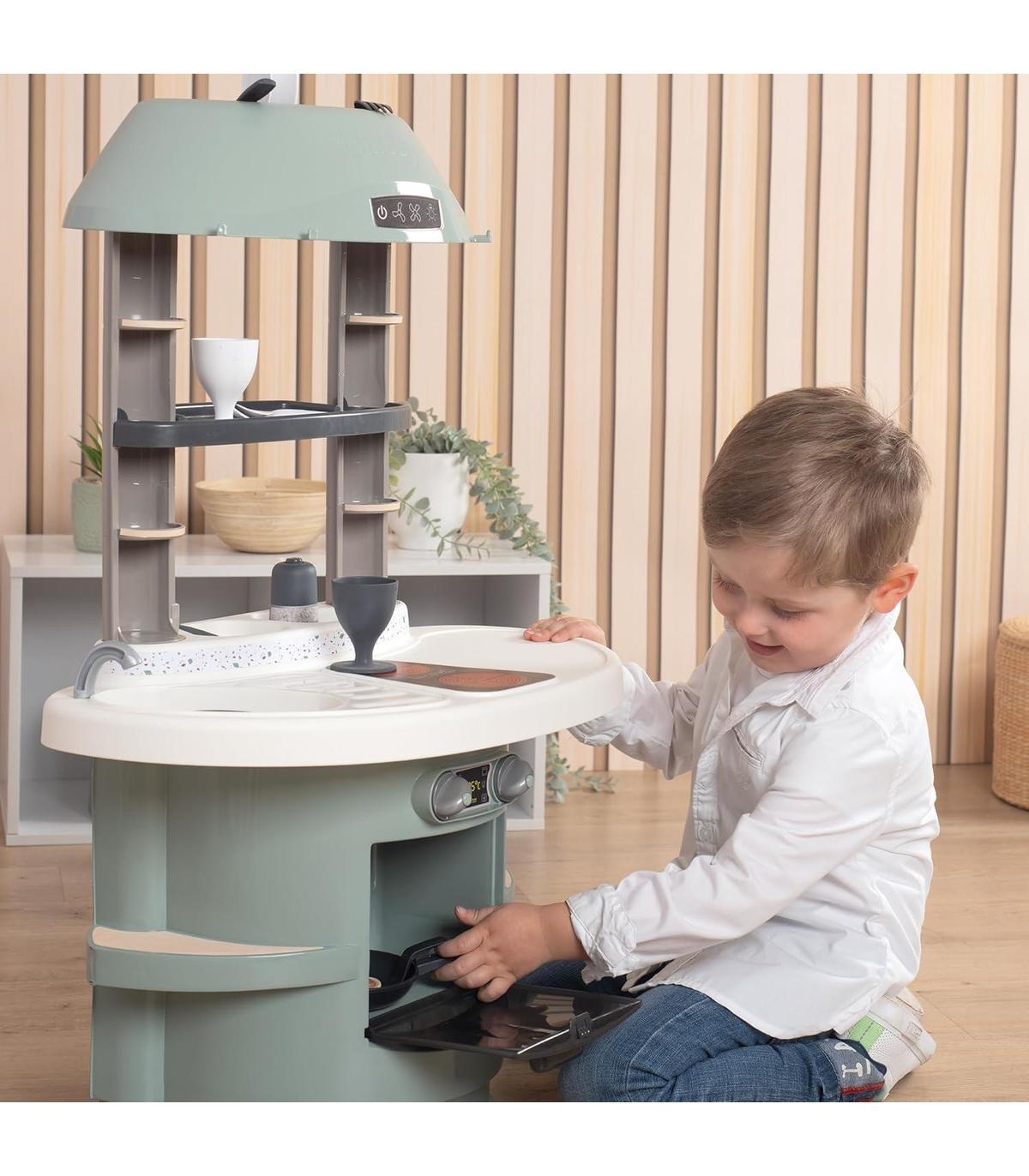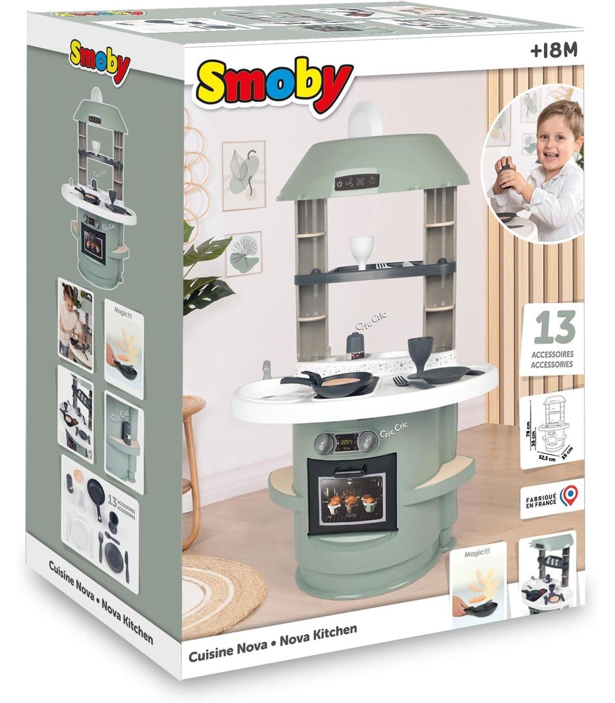 La cocina de juguete Nova de Smoby acompaña a los pequeños chefs en sus primeros experimentos en la cocina Cocina compacta de juguete, donde los más pequeños pueden preparar sus platos favoritos y aprender a cocinar y ordenar de forma lúdica Con su suave colorido, la cocina Nova responde a las tendencias de diseño actuales y encaja con la misma armonía en la habitación de los niños o el salón Como cocinero, necesitan naturalmente el equipamiento adecuado para practicar: este modelo de cocina dispone de una placa, un horno, un fregadero, una pequeña zona de comedor y mucho espacio para guardar accesorios; la cocina Nova incluye 13 accesorios: 2 platos, 2 vasos, cubiertos, una sartén, un molinillo de sal y pimienta con sonido 'crick crack' y una tortita Dimensiones del producto (LxAxA): 52,5 x 35 x 78 cm; altura de la encimera: 36 cm; fabricado en Francia; a partir de 18 meses