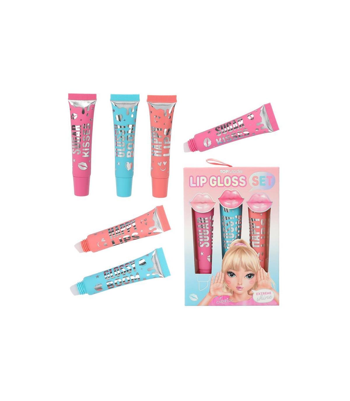 ¡Brillo extremo por tres! Este set de brillos labiales de TOPModel se compone de tres tubitos de 8 ml (0.28 fl.oz) cada uno, en tonos diferentes de rosa, con tres aromas diferentes: arándano, manzana y fresa. Los tubitos son muy manejables y están recubiertos con film plata brillante.