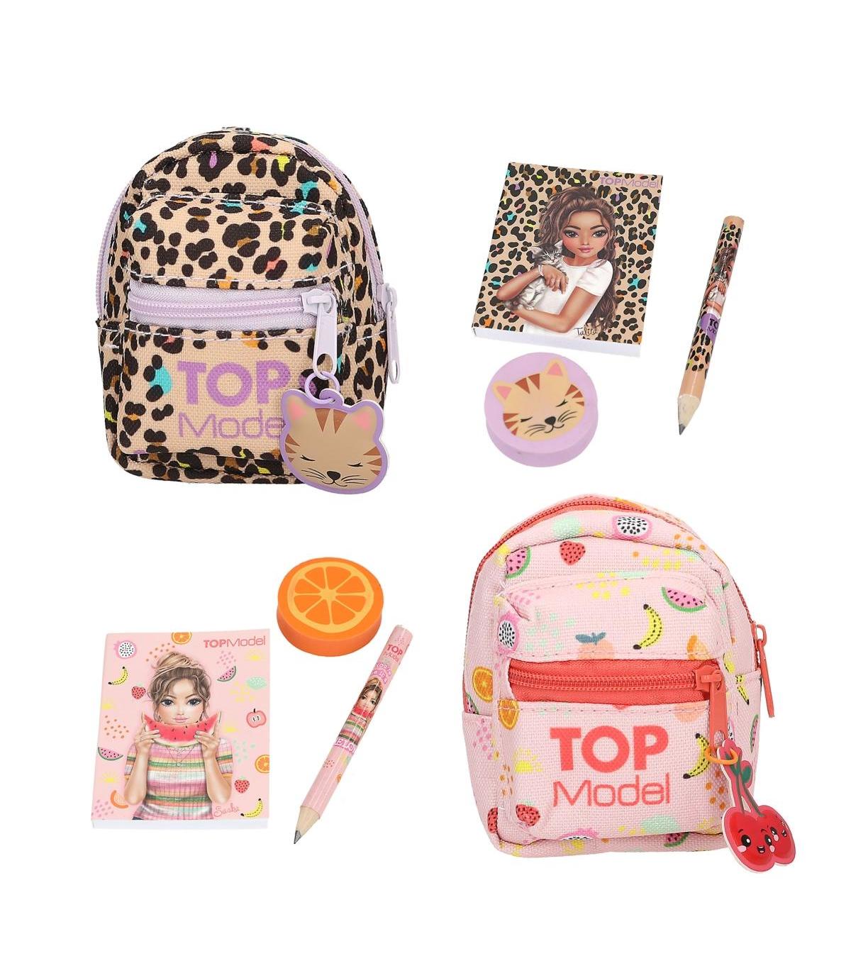 Las mini mochilas de TOPModel llevan en su interior todo lo necesario para tomar notas: 1 lápiz pequeño, 1 goma redonda decorada y un bloc monísimo con la tapa decorada con una modelo sobre fondo igual que la mochila. Disponibles dos diseños: rosa con un alegre estampado de frutas y colgante de cerezas y animal print con un gato colgando. Con mosquetón y cremallera. Material: poliéster 100 por 100.