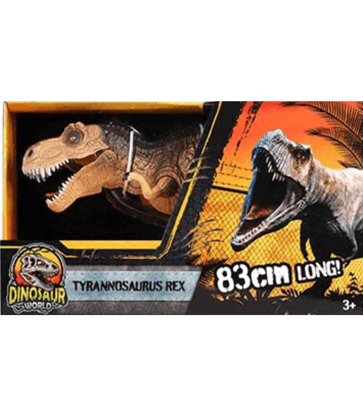 Prepárate para dejar con la boca abierta a pequeños (y grandes) amantes de los dinosaurios con nuestro Tyrannosaurus Rex de 83 cm. Este espectacular dinosaurio de juguete combina tamaño, efectos, diseño realista y diversión para crear una experiencia única en el juego. ?? Características destacadas: Tamaño imponente: 83 cm de longitud que lo hacen uno de los dinosaurios más grandes de la colección. Sonido y luces: cuando presionas el botón, ruge e ilumina sus ojos o boca (dependiendo del modelo), lo cual añade realismo al juego. Partes articuladas: cabeza, patas y cola permiten posturas dinámicas para simular movimientos naturales. Detalles realistas: escamas, texturas y acabados pintados que evocan la apariencia del T. rex. Construcción robusta: plástico resistente apto para el uso intensivo habitual en juguetes de acción. Beneficios educativos: Aunque sea un dinosaurio gigante, este juguete también tiene un valor didáctico. Favorece el juego simbólico (representar historias con dinosaurios), estimula la imaginación y motiva preguntas sobre la paleontología, la ciencia y el mundo prehistórico. Por su gran tamaño y presencia, es un juguete que puede convertirse en pieza central para ambientes lúdicos en casa. Consejos de uso y seguridad: Requiere pilas (normalmente AA o AAA, verificar con el fabricante). Retira todos los plásticos y protecciones antes de entregarlo al niño. No recomendable para menores de 3 años debido a piezas pequeñas que podrían desprenderse. Supervisar el juego, especialmente si se combina con otros dinosaurios o accesorios.