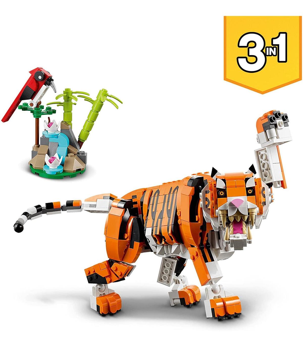 Este set LEGO Creator 3 en 1 incluye 3 animales de juguete que los peques podrán construir: un tigre, un panda rojo y una carpa koi de juguete, y una maqueta de menor tamaño Entre sus muchos detalles se incluyen el tigre con un pájaro rojo y un entorno selvático, el panda rojo con un bonsái y bambú y la carpa koi con nenúfares El tigre articulado de juguete puede mover su cuerpo, cabeza, boca, cola, patas y hombros, y el panda rojo de juguete puede mover su cabeza, cola, patas, pies y orejas La carpa koi de juguete para construir tiene un cuerpo articulado, aletas y cola para vivir divertidas aventuras submarinas Los peques podrán vivir increíbles aventuras repletas de acción con los 3 animales de juguete para niños, o hacer volar su imaginación y crear un nuevo animal con los ladrillos Este emocionante set LEGO Creator 3 en 1 con su tigre majestuoso es un gran regalo de cumpleaños o para cualquier ocasión, y un estupendo juguete para niños a partir de 9 años
