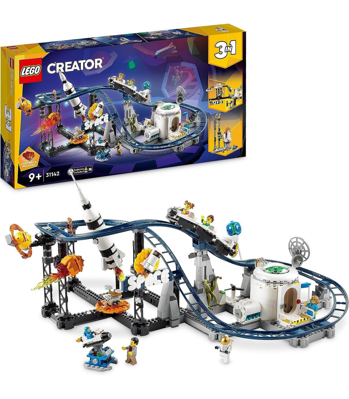 Lego 31142 - Montaña Rusa Espacial Los niños pueden disfrutar de una increíble aventura espacial con el set de juego LEGO Creator 3en1 Montaña Rusa Espacial. Este emocionante juego incluye tres asombrosos modelos de atracciones para construir y reconstruir, ¡todo en una sola caja! Los aficionados al espacio pueden construir 3 atracciones LEGO diferentes: construye la Montaña Rusa Espacial y reconstrúyela para convertirla en una torre de caída libre con ascensor o en un tiovivo espacial giratorio La montaña rusa cuenta con una pista llena de curvas por la que circulan 3 vagones rodeados de planetas, estrellas fugaces y meteoritos, mientras que la torre de caída libre cuenta con un elevador que sube hasta arriba antes de caer de nuevo Para continuar la trepidante aventura intergaláctica, los jóvenes exploradores del espacio pueden reconstruirlo y descubrir un tiovivo con un minicohete espacial y un transbordador espacial que giran a toda velocidad Este set LEGO Parque Espacial 3en1 también incluye un ladrillo luminoso LEGO que se puede utilizar para iluminar cada construcción: el meteorito de la feria, los propulsores de la lanzadera o la cabina del tiovivo