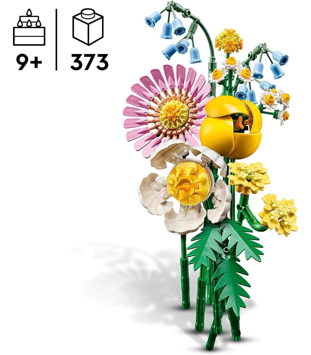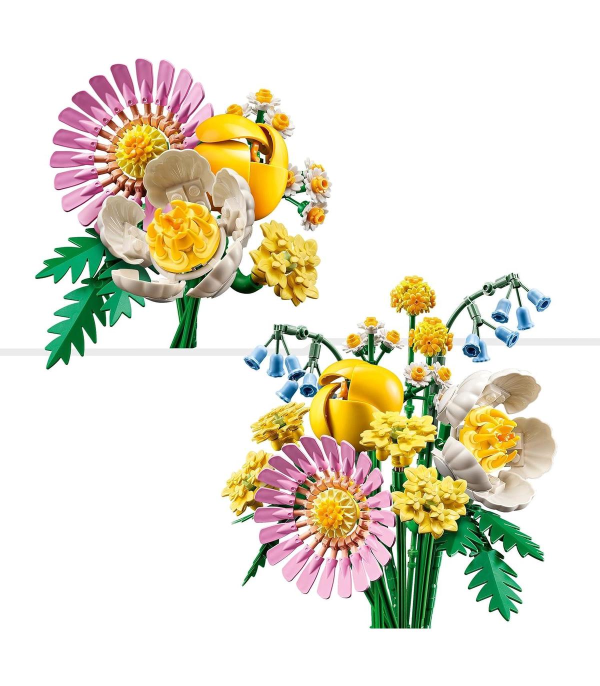 Flores LEGO: El ramo se llena de vida con 6 especies de flores primaverales en tonos pastel que representan craspedias, campanillas, helechos, milenrama amarilla, una gerbera, una peonía y un tulipán