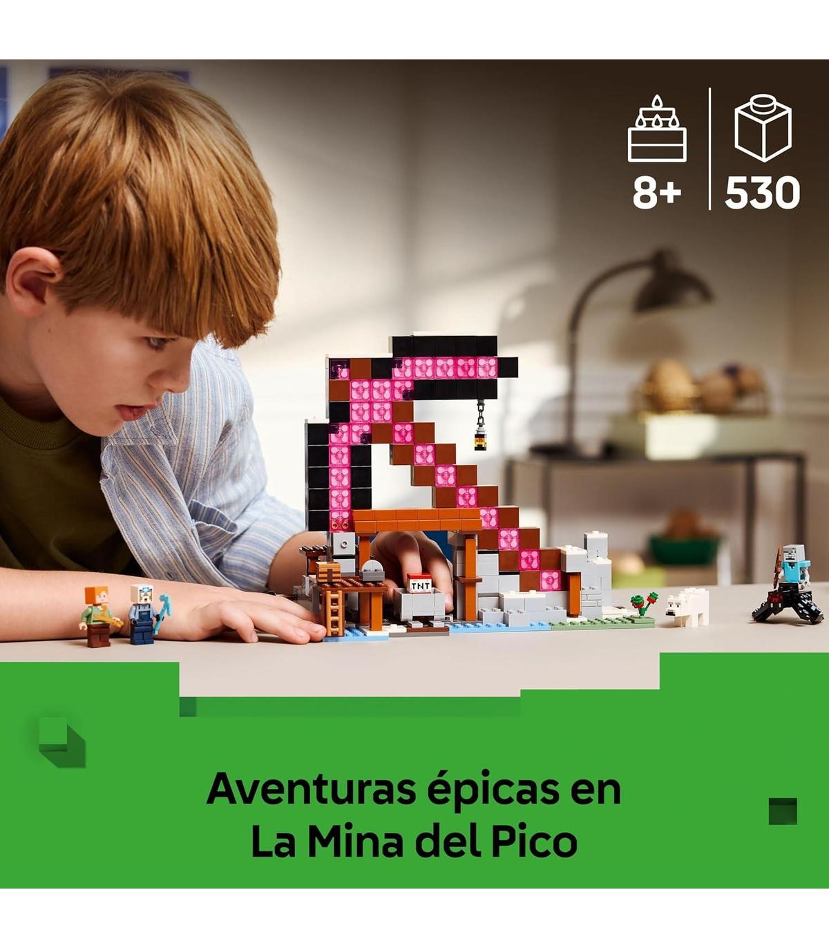 Lego 21277 - La Mina Del Pico Pico de juguete LEGO Minecraft: La Mina del Pico es un juguete de construcción para niños mayores de 8 años apasionados por Minecraft y una divertida decoración para el cuarto de juegos o el dormitorio Figuras de acción coleccionables: El set incluye figuras Minecraft de Alex, un minero y un jinete arácnido errante, además de una araña que puede llevar montada a uno de los personajes y una figura de un oso polar Juguete interactivo de aventuras mineras: Los peques extraen mineral de la mina, lo cargan en una vagoneta y lo transportan por la vía para guardarlo en un cofre; todo, mientras luchan contra un jinete arácnido hostil Acción explosiva con LEGO Minecraft: Cuando la vagoneta esté llena de dinamita, una función especial permite a los niños lanzarla contra la pared rocosa, abriéndose paso hacia el otro lado tras una explosión Regalo gamer: Este juguete interactivo LEGO Minecraft es idóneo como regalo para niños y niñas de 8 años en adelante que sean fans del videojuego y de la construcción con ladrillos LEGO Juegos de construcción en familia: La app LEGO Builder ofrece la función Construye en Compañía, una experiencia divertida y colaborativa para divertirse junto a familiares y amigos construyendo con LEGO Creatividad Minecraft: Los juguetes de construcción para niños LEGO Minecraft les proponen una manera distinta de disfrutar del videojuego; sus criaturas, escenas y funciones cobran vida mediante la creatividad tangible de los ladrillos LEGO